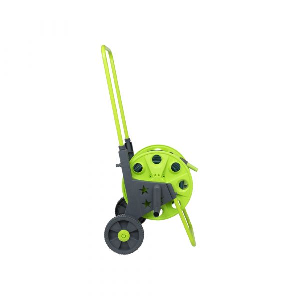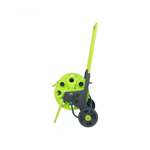 Slanghaspelwagen 30 meter Handige slanghaspelwagen op wieltjes incl. 30 meter tuinslang. De handgreep is in hoogte verstelbaar. Materiaal: kunststof en metalen buizen Word geleverd incl: 30 meter tuinslang 3 slangaansluitingen Sproeikop Aansluitslang van ongv. 120 cm.
