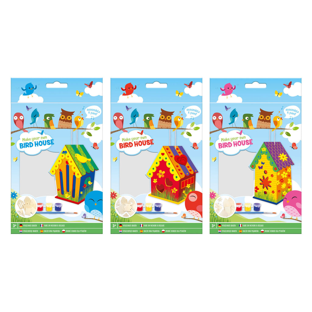 Knutselset voor het bouwen en verven van je eigen houten vogelhuisje voor in de tuin. verkrijgbaar in 3 verschillende varianten en geschikt vanaf 3 jaar.
