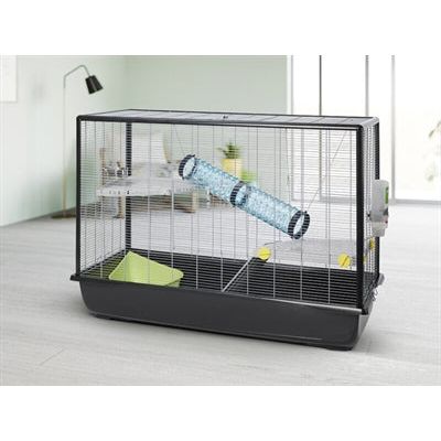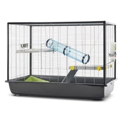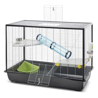 De kooi-inrichting bestaat uit twee etages in de vorm van een kwart cirkel met één ladder. De andere etage is bereikbaar via een buis die in de kooi gehangen kan worden. Daarnaast bevat deze kooi een voerbakje, drinkfles en toiletbakje.