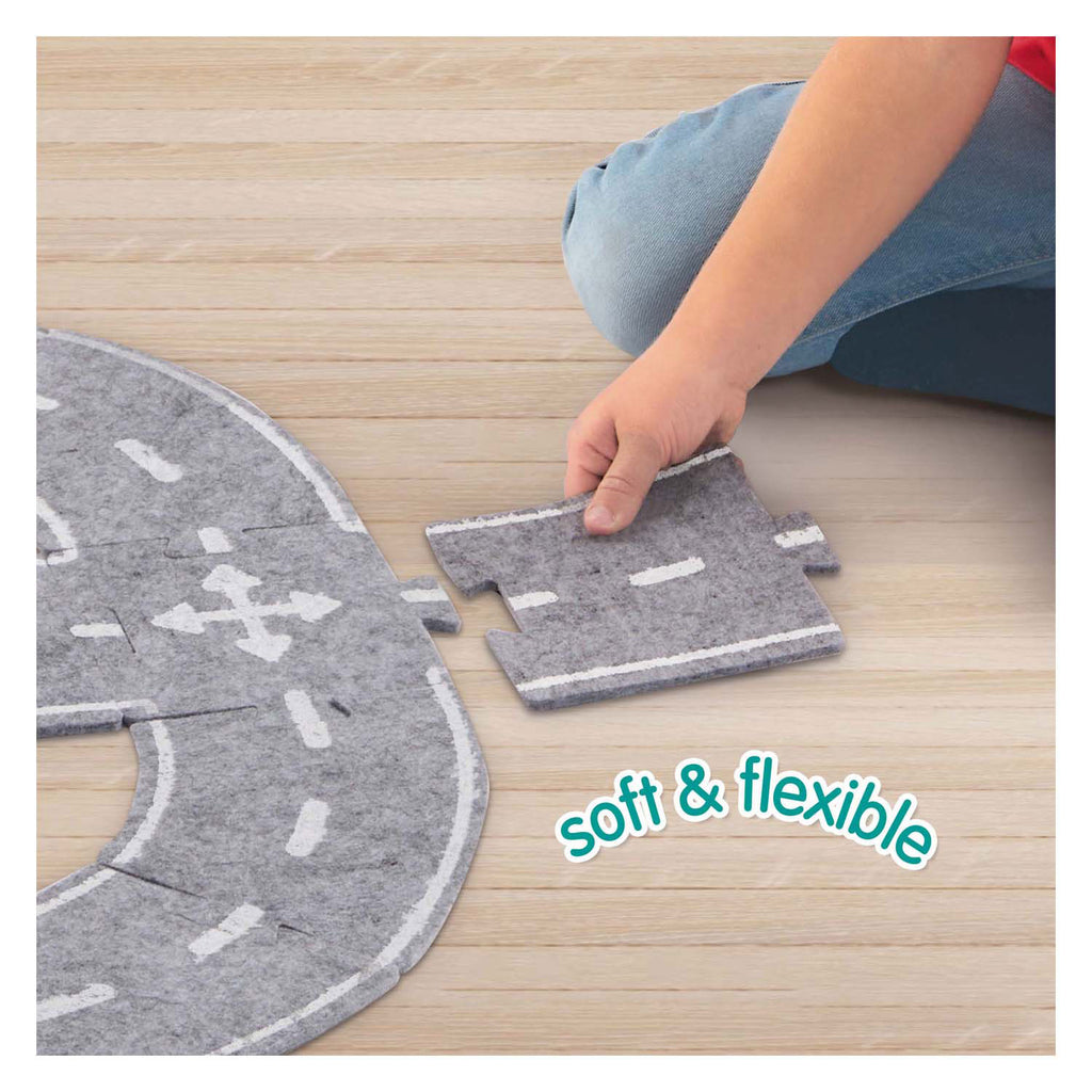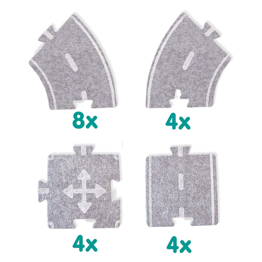Bouw je eigen wegennet met het 20-delige Vilten wegencircuit! Met deze dikke vilten wegstukken kun je eindeloos bestaan en je eigen parcours creëren. De puzzelverbindingen zijn eenvoudig aan elkaar te koppelen als een puzzel. De set bevat rechte delen, bochten en kruispunten en kunnen worden gebruikt in combinatie met alle kleine speelgoedauto's van bekende merken. Bovendien is de set verder uit te voegen met extra 20-delige of 40-delige sets, waardoor nog geen wegen mogelijk zijn!Perfect voor kinderen die houden van bouwen en spelen!