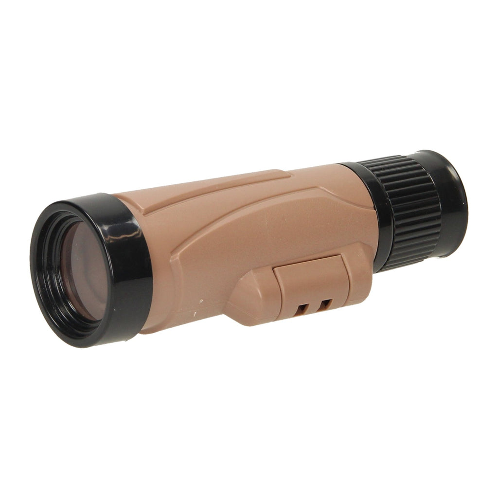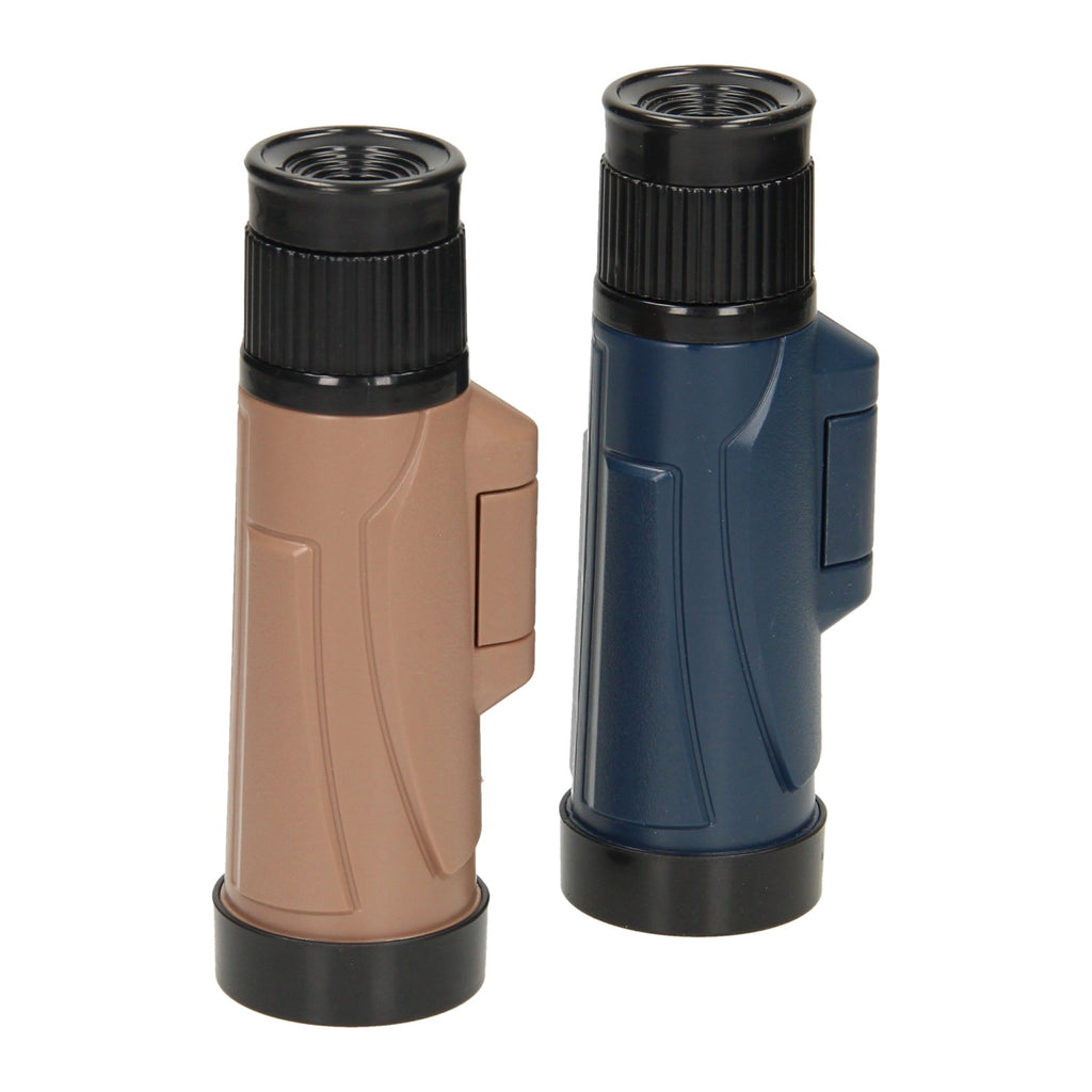 Enkele verrekijker in het donkerblauw of lichtbruin. De verrekijker is te gebruiken met een hand en geschikt voor kinderen vanaf 3 jaar.