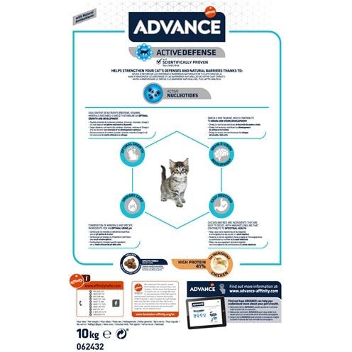 Advance Cat Kitten Chicken/Rice is volledig voer voor kittens tot 1 jaar oud, op basis van kip en rijst aangevuld met nucleotiden. De perfecte start voor jouw kleine kitten dus! Dit voer van Advance ondersteunt jouw kat tijdens zijn eerste levensjaar, wanneer hij de meeste lichamelijke veranderingen doormaakt. Het voer ondersteunt de groei van jouw kat en de gezondheid van de poes tijdens de zwangerschap en de zoogperiode. De formule met necleotiden, die ook in moedermelk te vinden is, ondersteunt de groei en helpt de hersenen en ogen te ontwikkelen, samen met toevoegingen als Omega 3 en taurine. Ook wordt de natuurlijke afweer van het kitten versterkt en zorgt voor de combinatie van mineralen en ingrediënten voor een optimale PH van de urine, om het risico op latere blaasproblemen te verminderen.