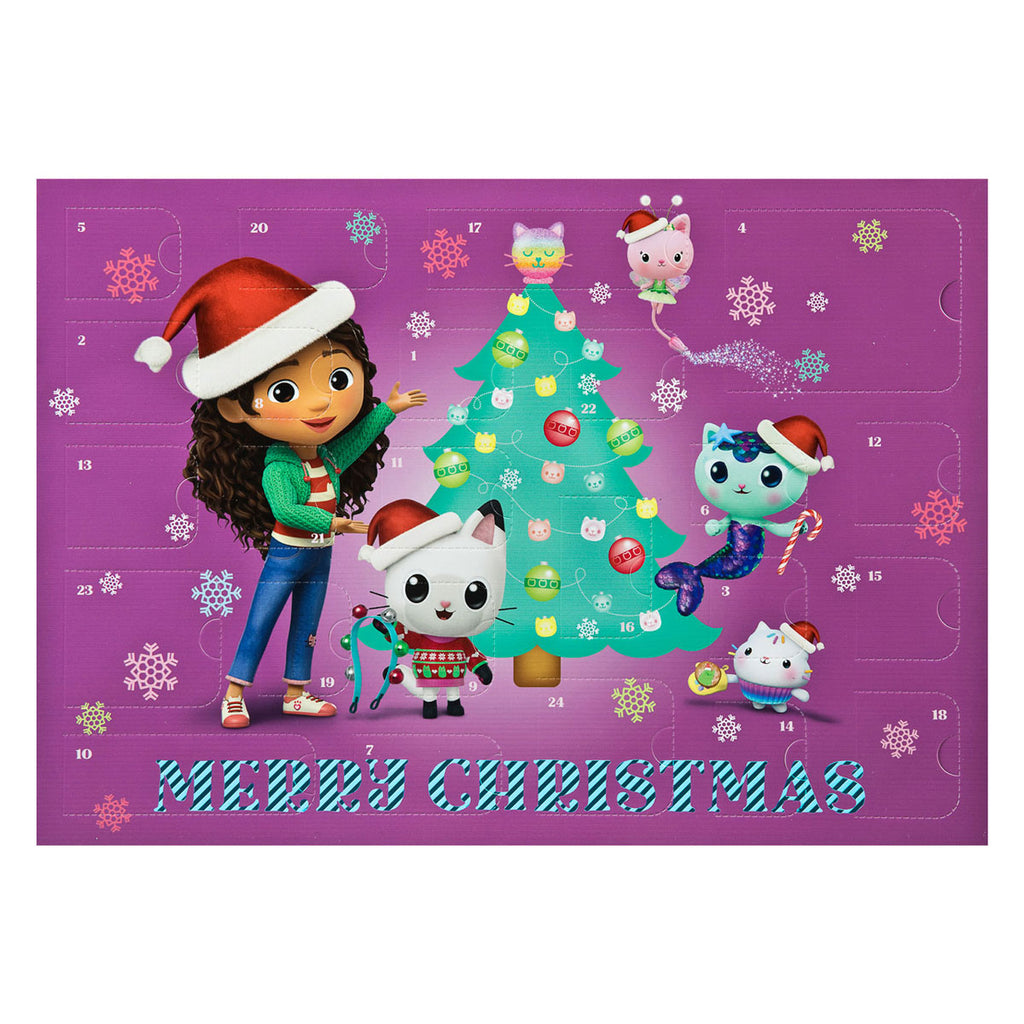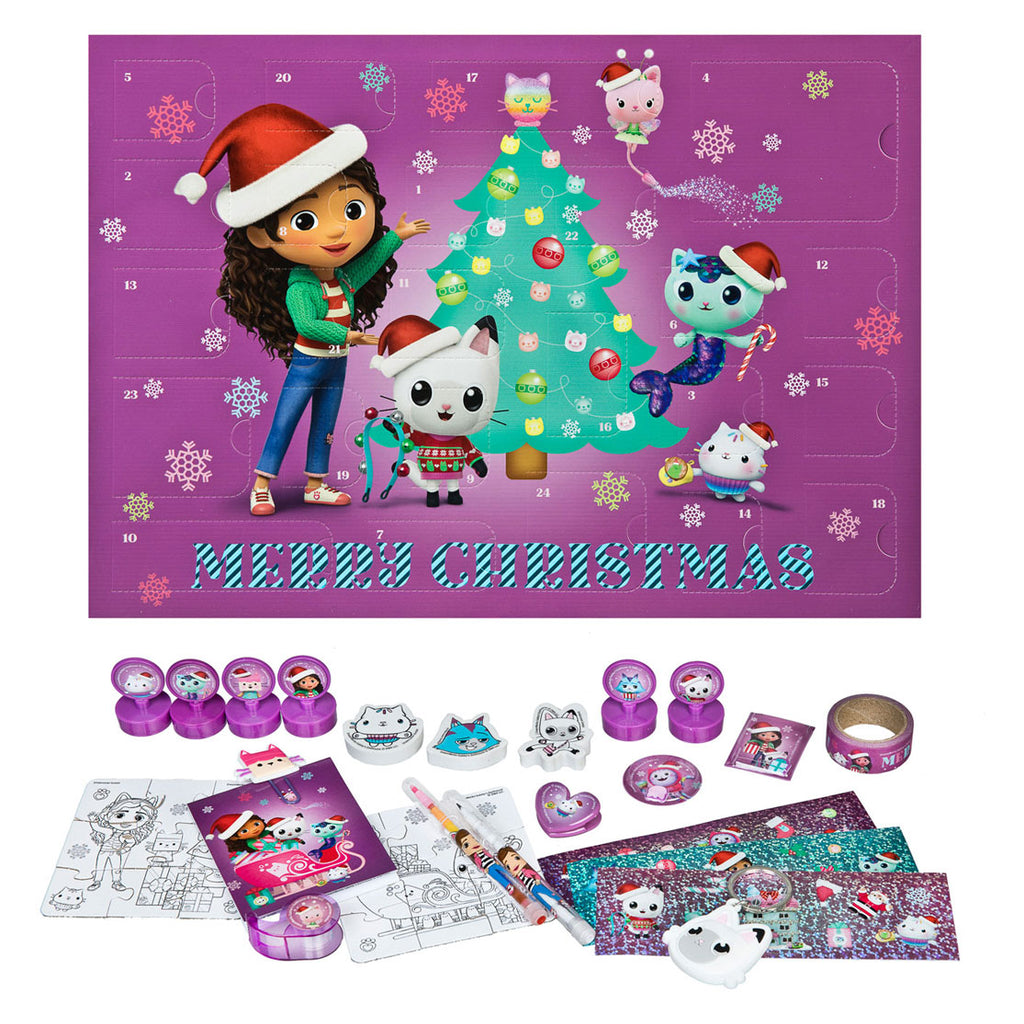 Gabby's Poppenhuis adventskalender met 24 kleine cadeautjes, waaronder gummen, stempels, vulpotloden en inkleurbare puzzeltjes. Geschikt vanfa 3 jaar.