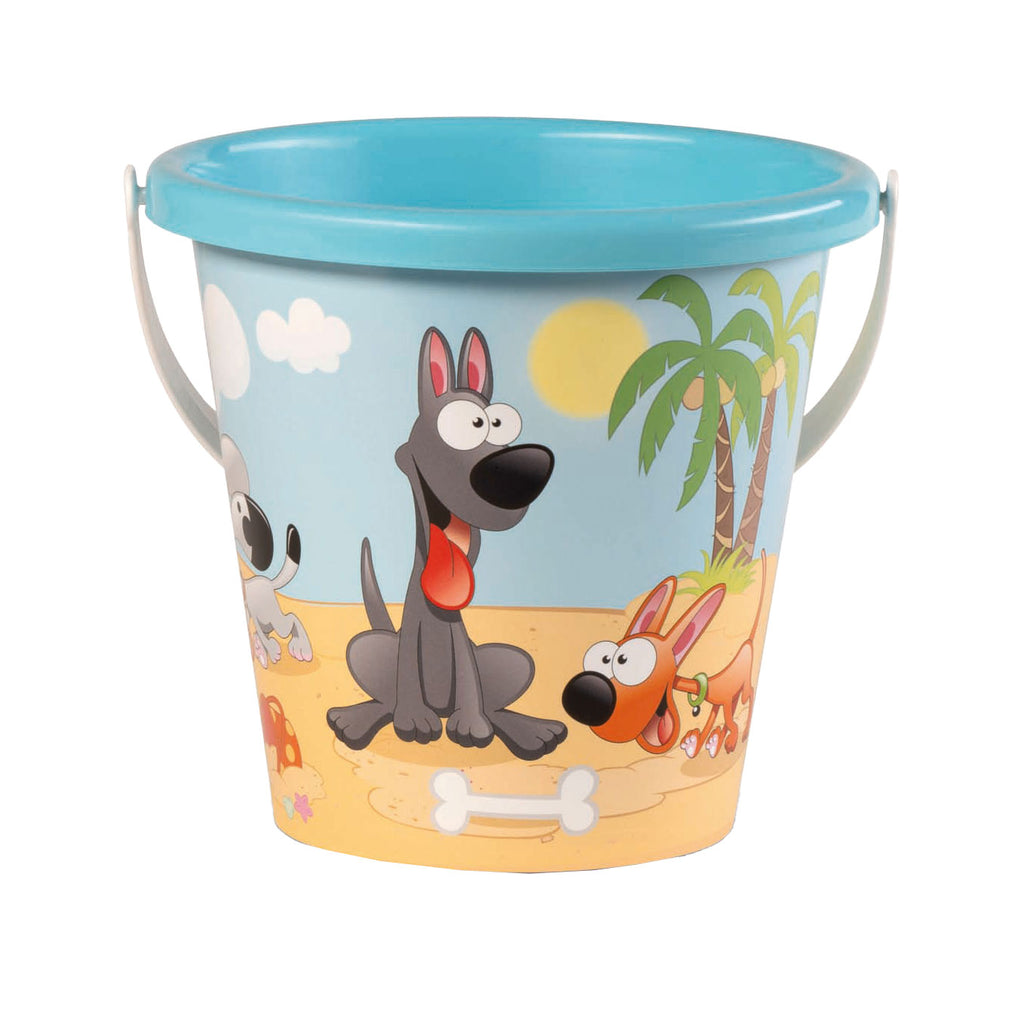 Emmertje voor het strand van zandbak, met afbeeldingen van honden. De emmer heeft een diameter van 16 cm. Geschikt voor kinderen vanaf 1 jaar.
