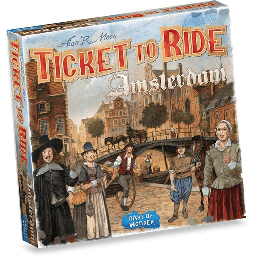 Welkom in het Amsterdam tijdens de 17de eeuw met Ticket to Ride Amsterdam. In de 17de eeuw was Amsterdam het bruisende hart van de wereldhandel en de rijkste stad ter wereld! Tijdens deze kortdurende variant uit de Ticket to Ride spellenreeks strijden de spelers tegen elkaar om de meest lucratieve handelsroutes te claimen, contracten te voltooien en waardevolle handelswaren te verzamelen uit de straten van deze legendarische stad! Zoals bij alle Ticket to Ride spellen probeert spelers de meeste punten te scoren door routes tussen twee locaties (uit de 17de eeuw) te claimen en bestemmingskaarten te halen (bij Ticket to Ride Amsterdam zijn dat contractkaarten). Nieuw bij deze versie is de mogelijkheid om bonuspunten te scoren dankzij handelsbonuskaarten die je verdient door routes te claimen met het kar-symbool. In deze uitgave van Ticket to Ride zijn de bekende treinkaarten vervangen door speciale transportkaarten en ook de miniatuurtreintjes zijn anders, dit zijn nu miniaturen van plastic karren, geheel in stijl van de 17e eeuw.