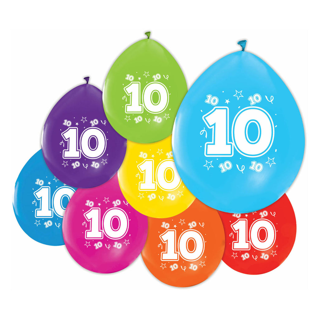 Deze set bevat 8 ballonnen van 30 cm groot. Elke ballon heeft een nummer 10 erop.