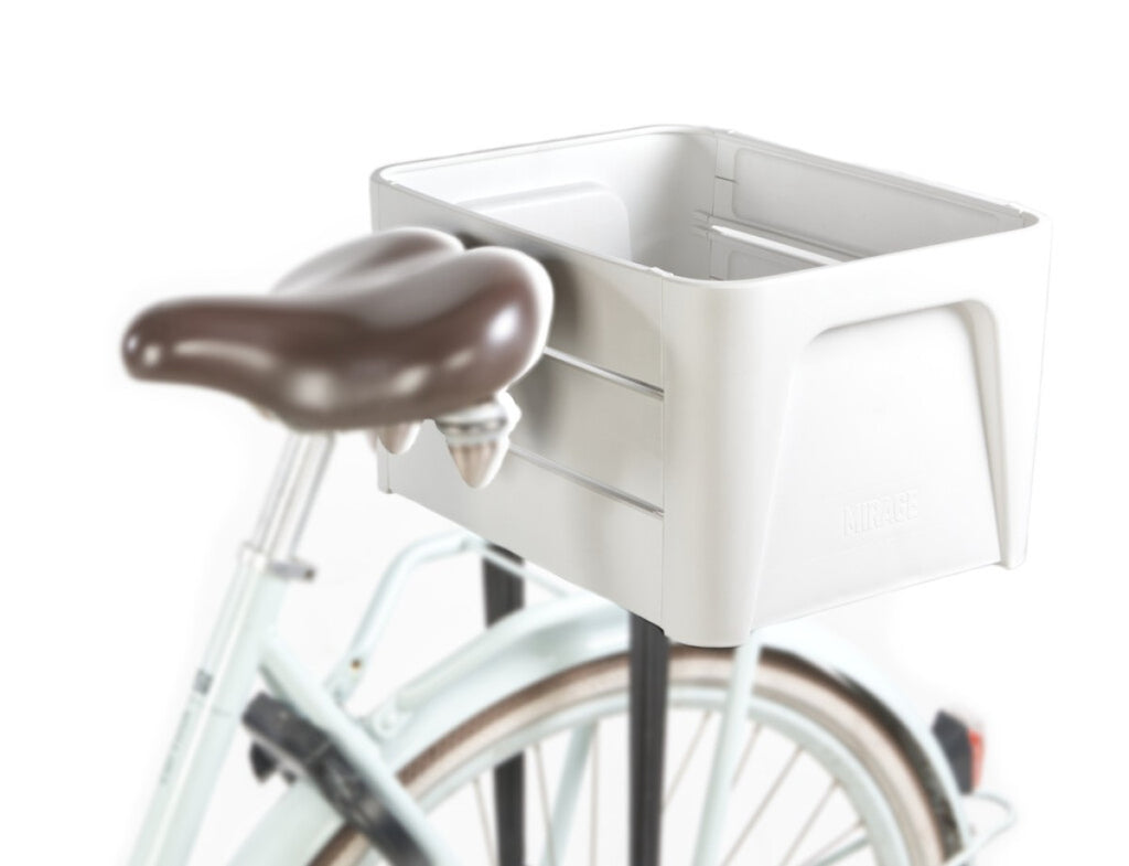 Dagelijks zien we de enorme transporten over de weg, de vaste magazijnen voor opslag en horen we de verhalen over een circulaire economie. Iedereen die fietst helpt mee aan een gezonder lichaam en een gezondere wereld. Dan doe je zo je beste en plaats je een krat op de fiets voor boodschappen van bagage, die precies het enorme transport en opslag (veel lucht) in de hand heeft gewerkt, voordat het bij jou kwam. Daarnaast doen veel kratten, die nu op de markt zijn, niet mee aan een circulaire economie – ze zijn niet van gerecycled materiaal, niet recyclebaar en vooral gemaakt in China. De mensen achter Mirage hebben daar wat op gevonden. Een krat ontworpen en geproduceerd in Nederland, die heel compact is voor transport en opslag, éénmalig door jezelf in elkaar gezet kan worden tot een prachtige blikvanger op je fiets en die gemaakt is van recyclebaar materiaal dat ook weer gerecycled kan worden. Naast het feit dat we zo de wereld een beetje gezelliger proberen te maken, is er ook nog geen wereld aan bagage in. Werelds toch! Afmeting krat 38x29c22CM (LxBxH). Gewichtkrat 1500 gram. Inhoud krat 24 liter. Inhoud doos: 2x zijkant 9x panelen, 3 voorkant - 3 achterkant - 3 bodem 8 tie-wraps voor montage aan drager