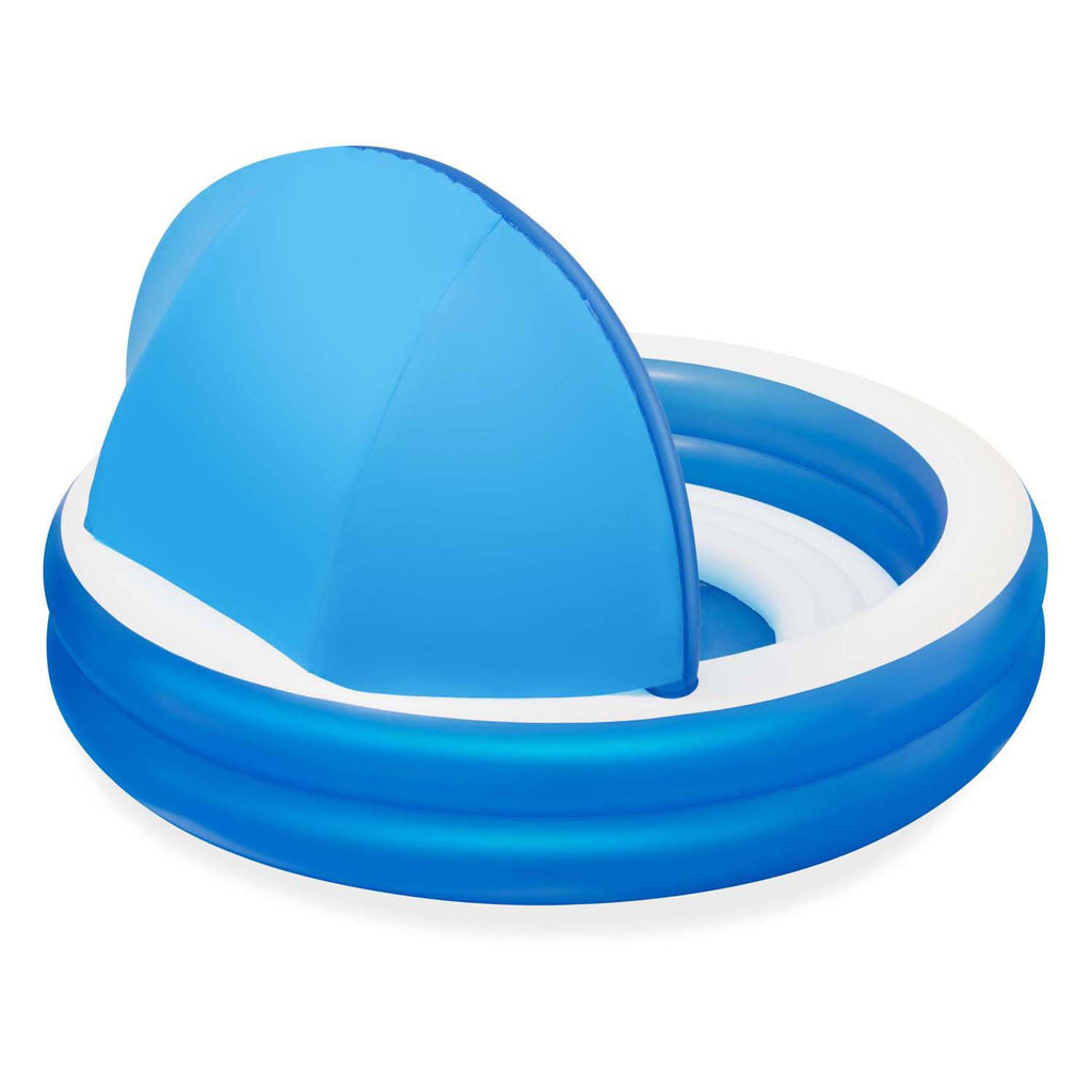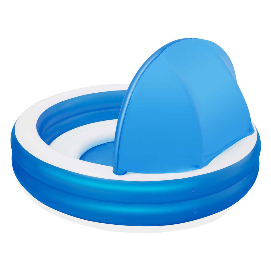 Rond familiezwembad met een geïntegreerd zonnescherm voor warme dagen in de zon of in de schaduw. Door het zonnescherm kan er gekozen worden om te genieten van de schaduw, of om te genieten van het opblaasbare bankje in de zon. Het zonnescherm is voorzien van een UV-bescherming om veilig te genieten. Het bad heeft een watercapaciteit van 850 liter en is geschikt voor volwassenen en kinderen vanaf 6 jaar. Afmeting (L x B x H): 241x241x140 cm
