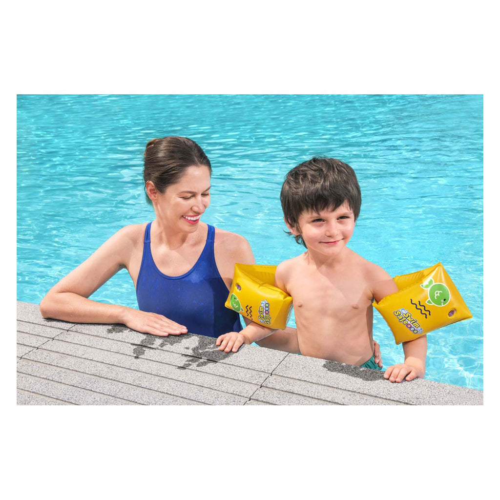 Geef uw kind een boost van zelfvertrouwen in het water met de Swim Safe ABC WonderSplash Opblaasbare Zwemarmbanden S/M!Stap C zwemarmbanden geef kinderen van 3-6 jaar een boost van zelfverzekerd terwijl ze drijven en hun zwemvaardigheden oefenen in deze flexibele, maar knusse zwembandjes voor beginners. De zwemarmbanden hebben een dubbele luchtkamer voor extra veiligheid en drijfvermogen, zodat uw kind zich veilig kan voelen terwijl hij zich comfortabeler voelt in het water.Het Swim Safe ABC stap voor stap programma begint met de stap A producten. Deze zijn voor baby's en peuters die maximale ondersteuning nodig hebben. Stap B zwemvesten zijn voor peuters die zelfverzekerd beginnen te krijgen, maar nog niet zelfstandig kunnen zwemmen. Stap C zwemarmbanden zijn voor kinderen die de basisprincipes van zwemmen beginnen te leren.Met een heldere, opvallende gele kleur en het gemakkelijk opblazen en leeglopen zijn de Swim Safe ABC WonderSplash Zwemarmbanden gemakkelijk op te bergen voor de volgende speeldag van uw soort!