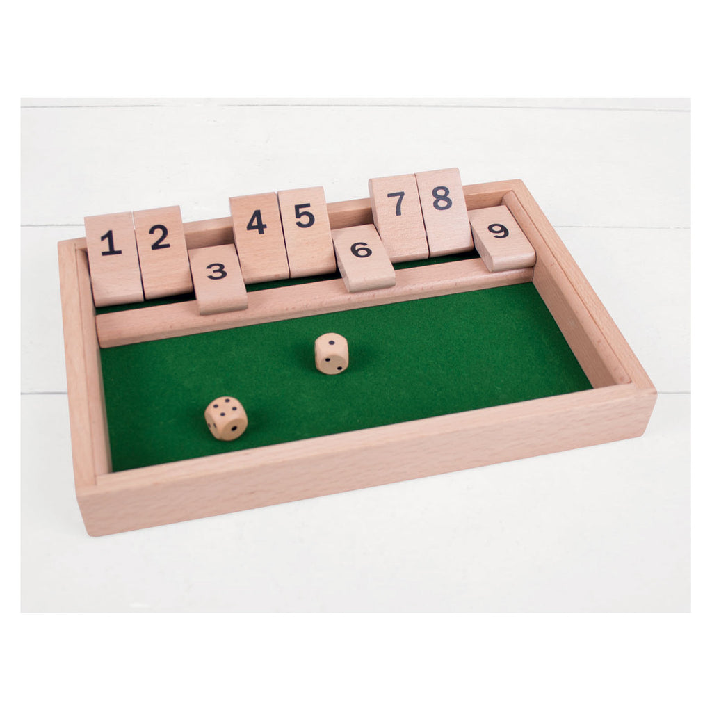 Een dubbel- en kansspel voor 2 of meer spelers. Het doel van het spel is om zoveel mogelijk van alle cijfers op het speelveld dicht te klappen. De speler die erin slaagt om alle cijfers om te draaien, is de winnaar! Als er geen enkel cijfer dichtgeklapt wordt, worden deze cijfers samen opgeteld en wint de speler met de minste punten. Geschikt voor kinderen vanaf 3 jaar.