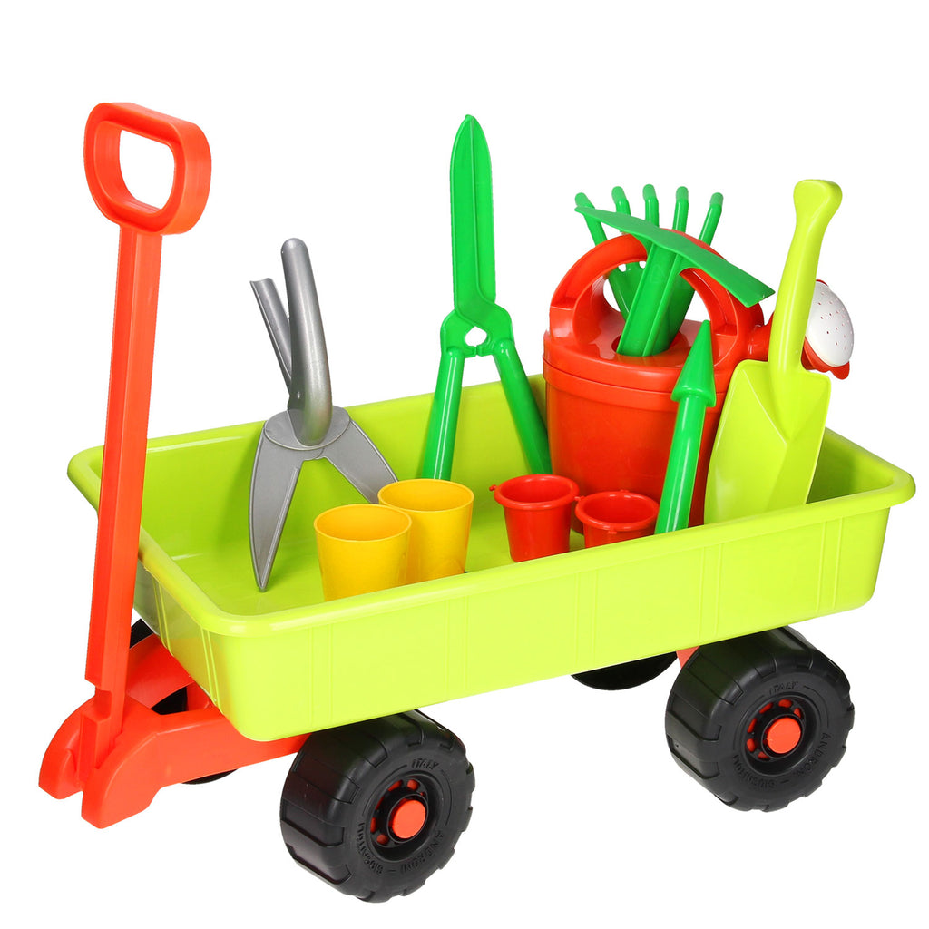 Help een handje mee in de tuin met deze bolderkar met tuingereedschap. Met het gereedschap zoals een heggenschaar, een gieter, een hark, een tuinschep en verschillende emmertjes maak je de tuin weer aan de kant. De set is gemaakt van stevig kunststof en gemakkelijk mee te nemen aan het stevige handvat.