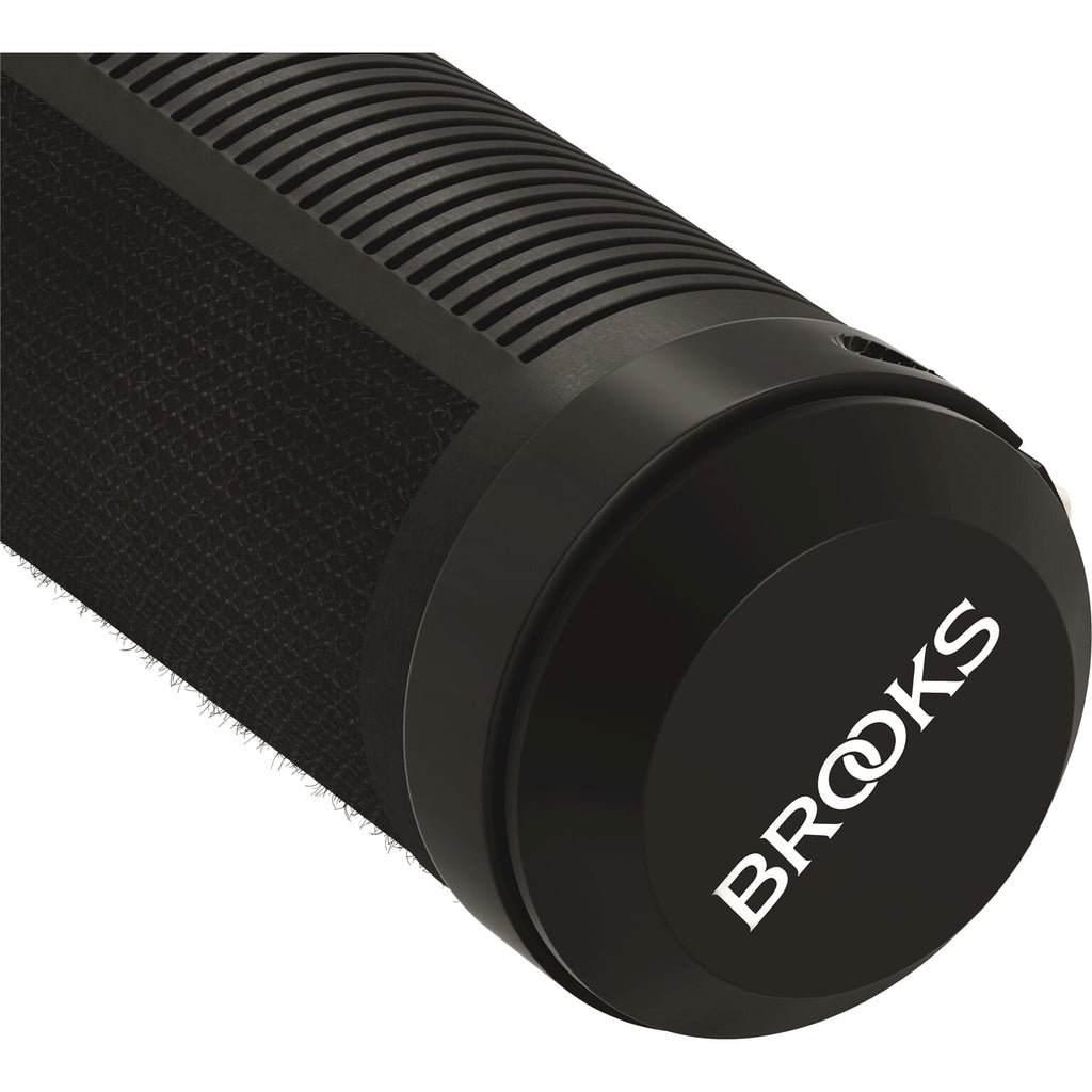 Brooks handvat Cambium All-weather gripshift zwart/zwart schakels 130 mm, rechts 100 mm. Brooks Cambium All-weather handvatten zijn gemaakt van polyester en rubber. Het wordt op zijn plaats gehouden door zwarte aluminium klemmen, zodat het gemakkelijk vervangbaar is