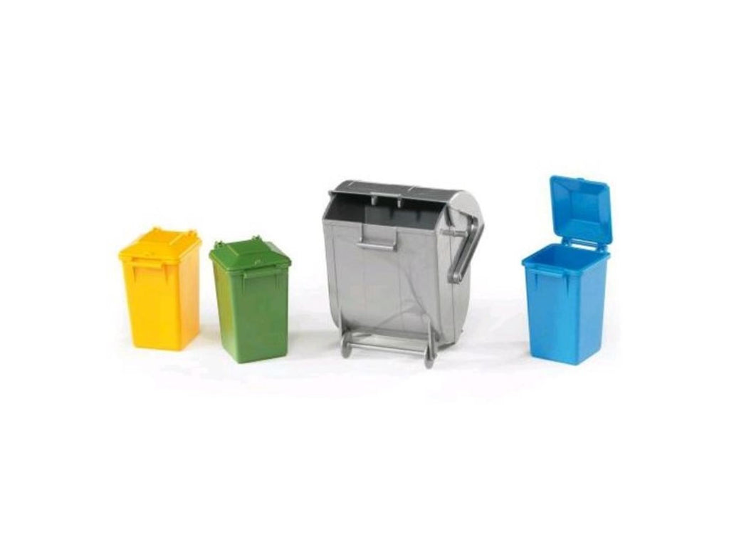 Deze set vuilnisbakken bestaat uit drie kleine, vuilnisbakken en een grote chemische. Om het nog leuker te maken, kunnen deze vuilnisbakken geplaatst worden op de vuilniswagen van Bruder.