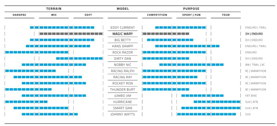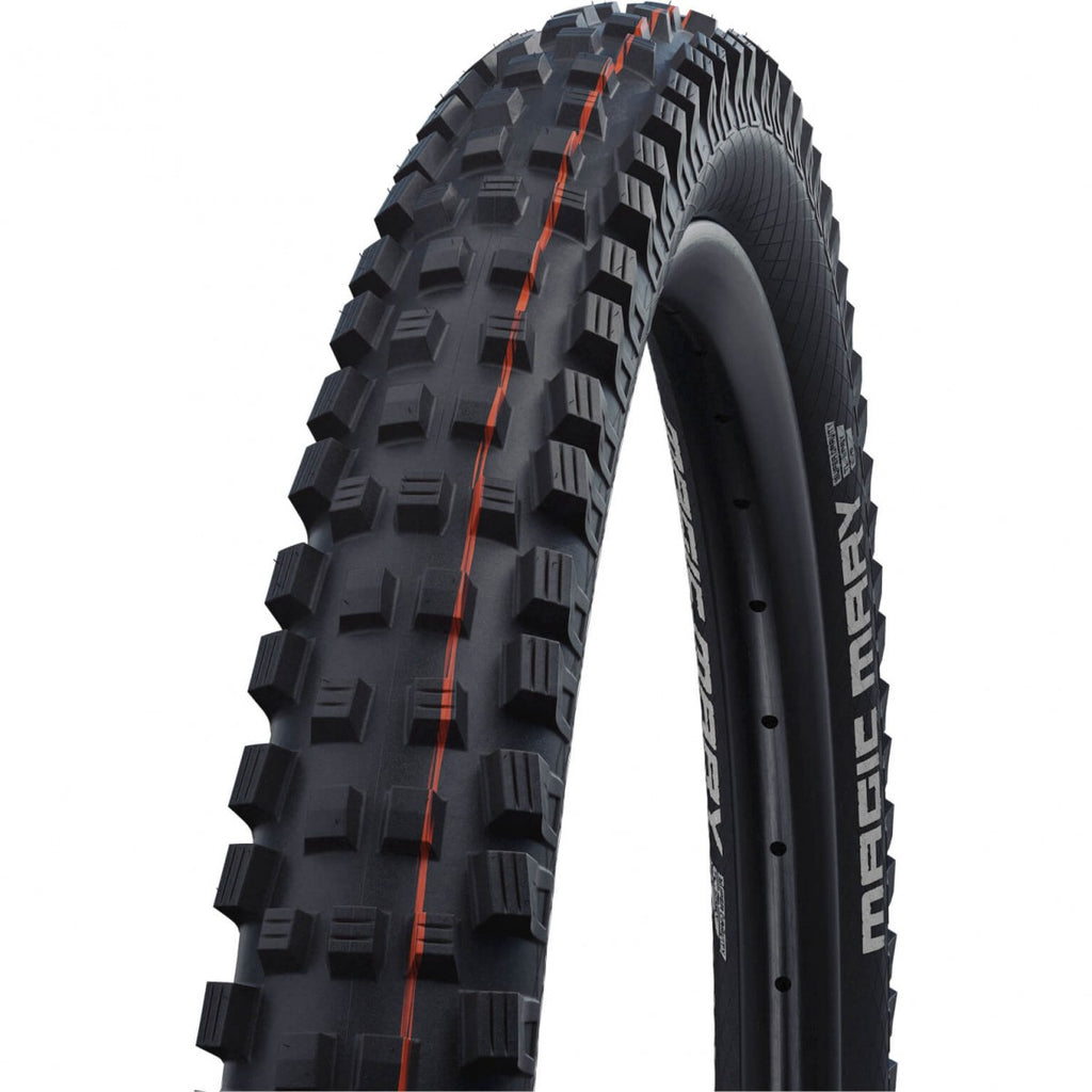 De Magic Mary Super Gravity van Schwalbe is de ultieme Gravity band en de onbetwiste eerste keuze van alle Schwalbe Downhill en Enduro atleten. Hij biedt perfecte allround eigenschappen voor bijna alle routes en omstandigheden. Het tot in het kleinste detail ingewikkelde Intermediate profiel wordt gecombineerd met de beste verbindingen en constructies en verlegt zo de grens tot ongekende afmetingen. De sterke schoudernoppen en een agressieve, open profielontwerp zorgen voor maximale remtractie en optimale grip in bochten, zelfs op modderige oppervlakken. Met de voor Magic Mary aan de overkant V-groeven heeft elke individuele nok nog contact met de grond voor nog grip. Afgeschuinde platte noppen in het midden van het lusvlak benutten het rolgedrag. Productspecificaties: - Grootte: ETRTO 62-584 (27.5 x 2.40 Inch) - Type: Vouwband - Rubbermengsel: ADDIX Soft - Uitvoering: Super Gravity - Kleur: Zwart - Afdichting: TLE - Gewicht: 1250 gram - Bandenspanning: Max/ 3.50 bar (max. 50 PSI) - Max. belasting: 115 kg - EPI: 67 - ECE: E-50 - Profiel: HS447 - Binnenbanden: 21, 21A, 21AP, 21+AP, 21FSchwalbe buitenband Magic Mary Evo SuperGravity TLE 27.5 x 2.40, 62-584 B/B-SK HS447 ADDIX Soft 67EPI SnakeSkin zwart vouw