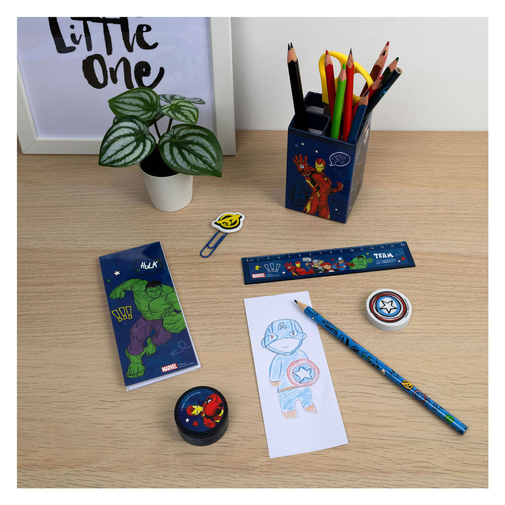 Gevulde bureauset met Avengers-thema. Deze mooie gevulde bureau stationary is donkerblauw gekleurd, met mooie afbeeldingen van de Avengers helden. Inhoud: potlood, 2D gum, liniaal, puntenslijper, notitieblok (14,5 bij 6 cm), grote paperclip met 2D topper. Afmeting: 23 bij14 bij 6,5 centimeter. Geschikt voor kinderen vanaf 3 jaar oud.