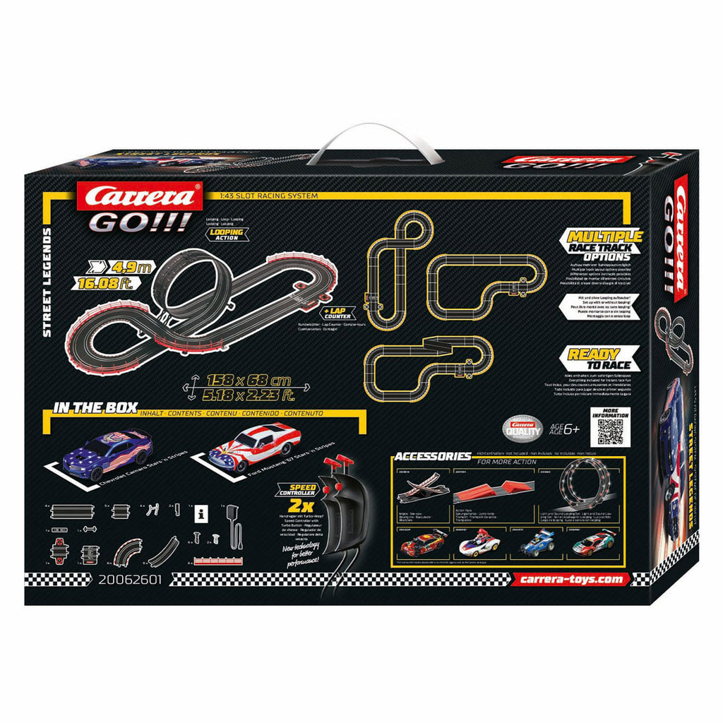 De spannende krachtmeting van de Amerikaanse muscle cars! Met de Carrera GO!!! Street Legends gaan twee van de beroemdste muscle cars uit de geschiedenis het circuit op. De Ford Mustang '67 Stars 'n Stripes en de Chevrolet Camaro Stars 'n Stripes nemen het tegen elkaar op in een spannend duel op het 4,9 meter lange circuit. De originele auto's laten het hart van elke racefan sneller kloppen en zorgen voor een spannende race waarin elke bocht en elk rechte stuk tot de laatste seconde wordt betwist. Circuitelementen zoals loopings en krappe bochten vereisen volledige concentratie en bliksemsnelle reflexen van de coureurs. Met de handbediening en turboknop wordt elke rit een snelle uitdaging die de woonkamer verandert in een spannende racearena - altijd op jacht naar de beste tijd.