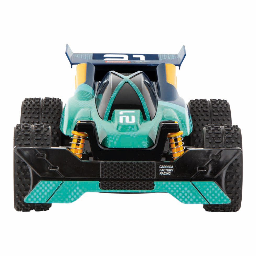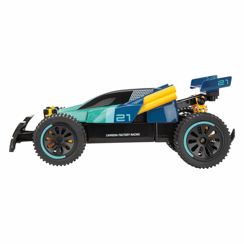 Hete race-actie in coole uitrusting. Met een lengte van 25,7 cm / 10,1 inch. Deze spannende buggy ha alt snelheden tot 12 km/u - 7,5 mph voor racen met alle actie. De 'Full Function'-technologie maakt een eenvoudige bediening mogelijk, zelfs voor beginners. Dartel door de bochten, baan je een weg naar de finish, neem het met gemak op tegen maximaal 15 rivalen! Er wordt een 3,2 V 320 mAh LiFePo4-batterij meegeleverd, die het vermogen levert dat nodig is voor races van maximaal 20 minuten, voordat je de pits in gaat om 50 minuten op te laden. Carrera RC Factory Racing #21 is een Ready to Run-auto die rechtstreeks uit de doos racet.