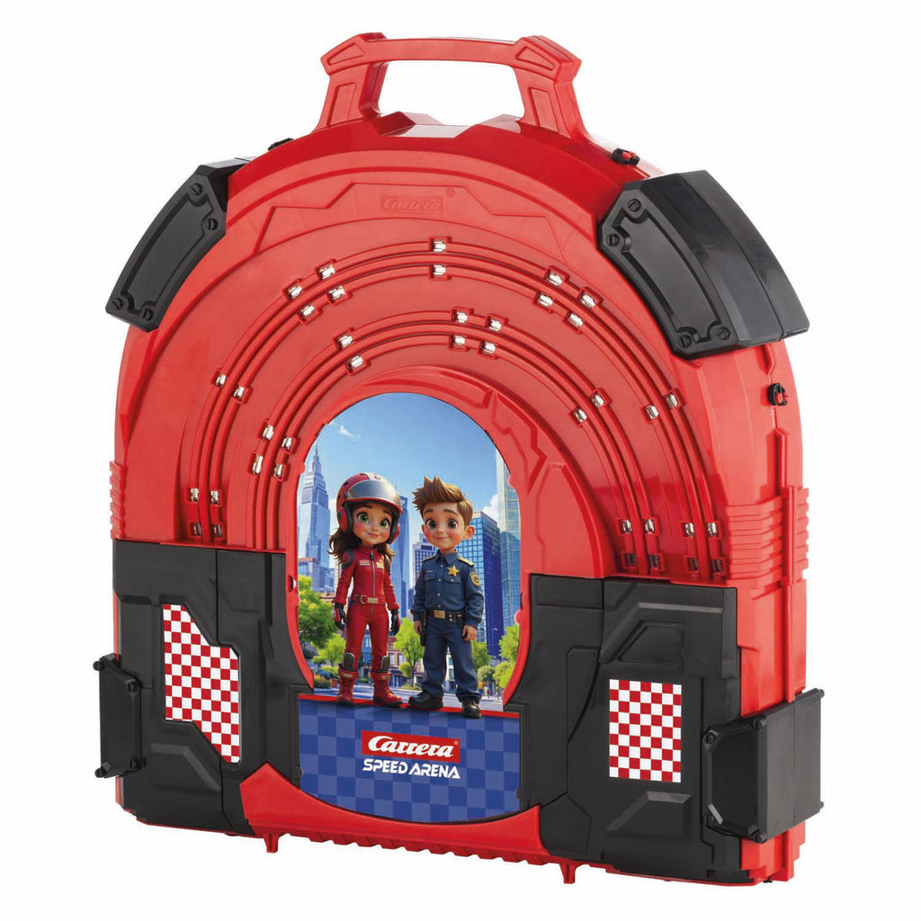 Draagbare racebaan in kofferformaat op schaal 1:50, met 2 voertuigen, handcontrollers en rondeteller. Baanlengte: 2,77 meter. Geschikt voor 2 spelers vanaf 3 jaar. Werkt op batterijen.