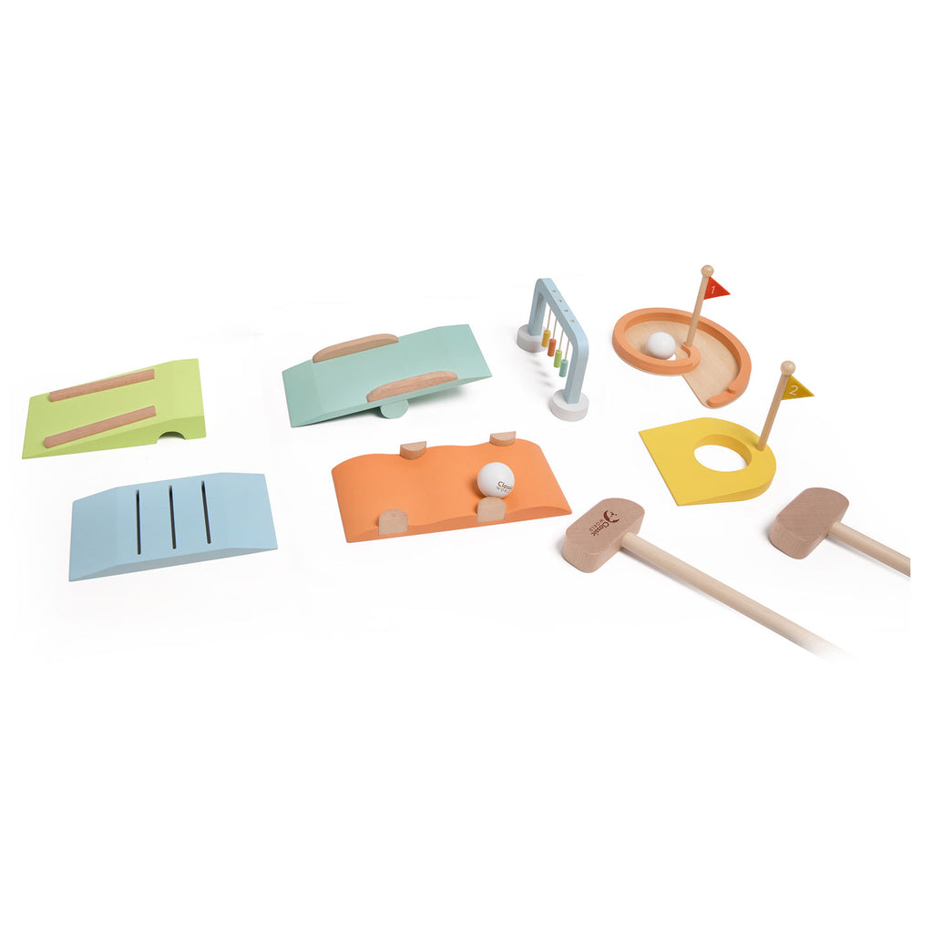 Houten minigolfset voor kinderen. Inhoud: 2 golfclubs, 2 puttingbekers, 2 balletjes en 5 obstakels. Geschikt voor binnen en buiten en voor kinderen vanaf 3 jaar oud.