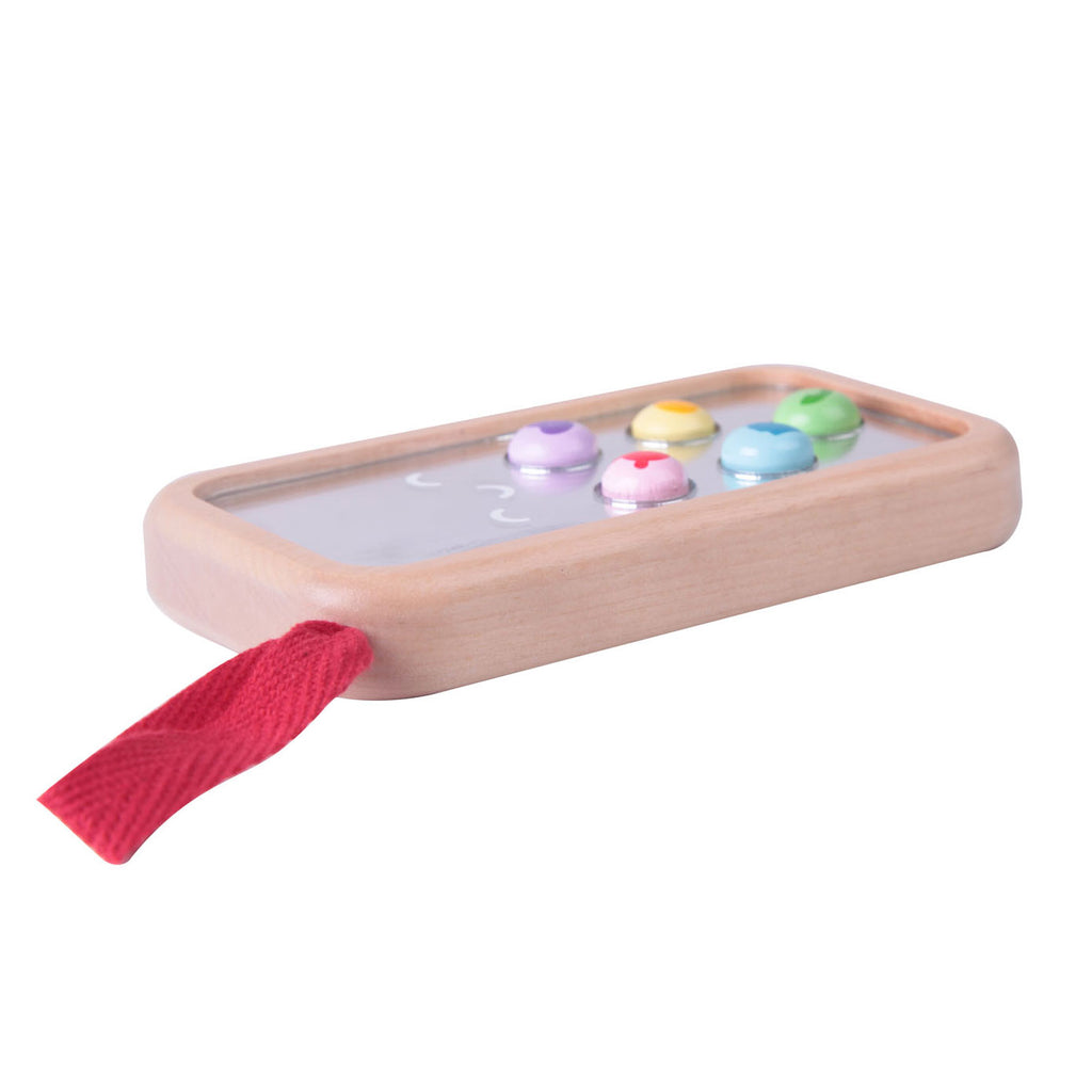 Jouw eerste eigen telefoon! Druk op de knopjes en hoor de verschillende geluidjes en muziekjes die uit de telefoon komen. De telefoon is gemaakt van hout en kunststof en heeft een touwtje aan de hoek om de telefoon vast te houden. Dit stimuleert het oefenen van de motoriek, net als de knoppen op de telefoon.
