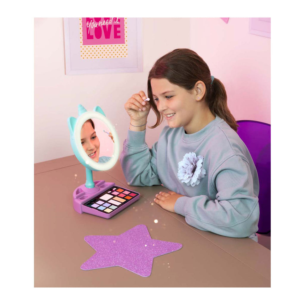 Een nieuwe, ronde, spiegel voor je make-up met een zeer stijlvol ontwerp. Een trendy en lichtgevende spiegel met een basis waarin een make-up palet zit en openingen om nagellak en accessoires in te bewaren. Een speelgoed dat de creativiteit op beautygebied stimuleert. De make-up in de kit is veilig omdat hij getest en gecertificeerd is, zodat kinderen veilig kunnen spelen en plezier hebben. De make-up is bovendien gemakkelijk te verwijderen met water. Aanbevolen leeftijd: vanaf 6 jaar