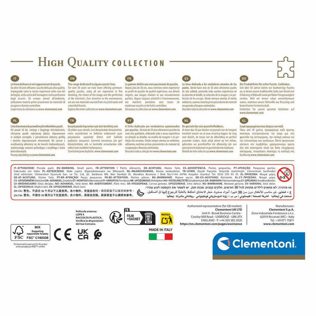 De meest aansprekende afbeeldingen, de grootste verscheidenheid aan formaten en de kenmerkende Clementoni-kwaliteit voor een reeks die overal de gouden standaard is voor liefhebbers van puzzels. Clementoni houdt altijd rekening met het milieu en maakt daarom veelvuldig gebruik van gerecyclede materialen, waarbij gebruik van vervuilende onderdelen wordt vermeden. Gemaakt in Italië. Kenmerken • Puzzel: ‘Olifanten Carnaval' in hoge kwaliteit • Aantal stukjes: 500 stukjes • Afmetingen: 49 x 36 centimeter • In compacte doos • High quality collectie