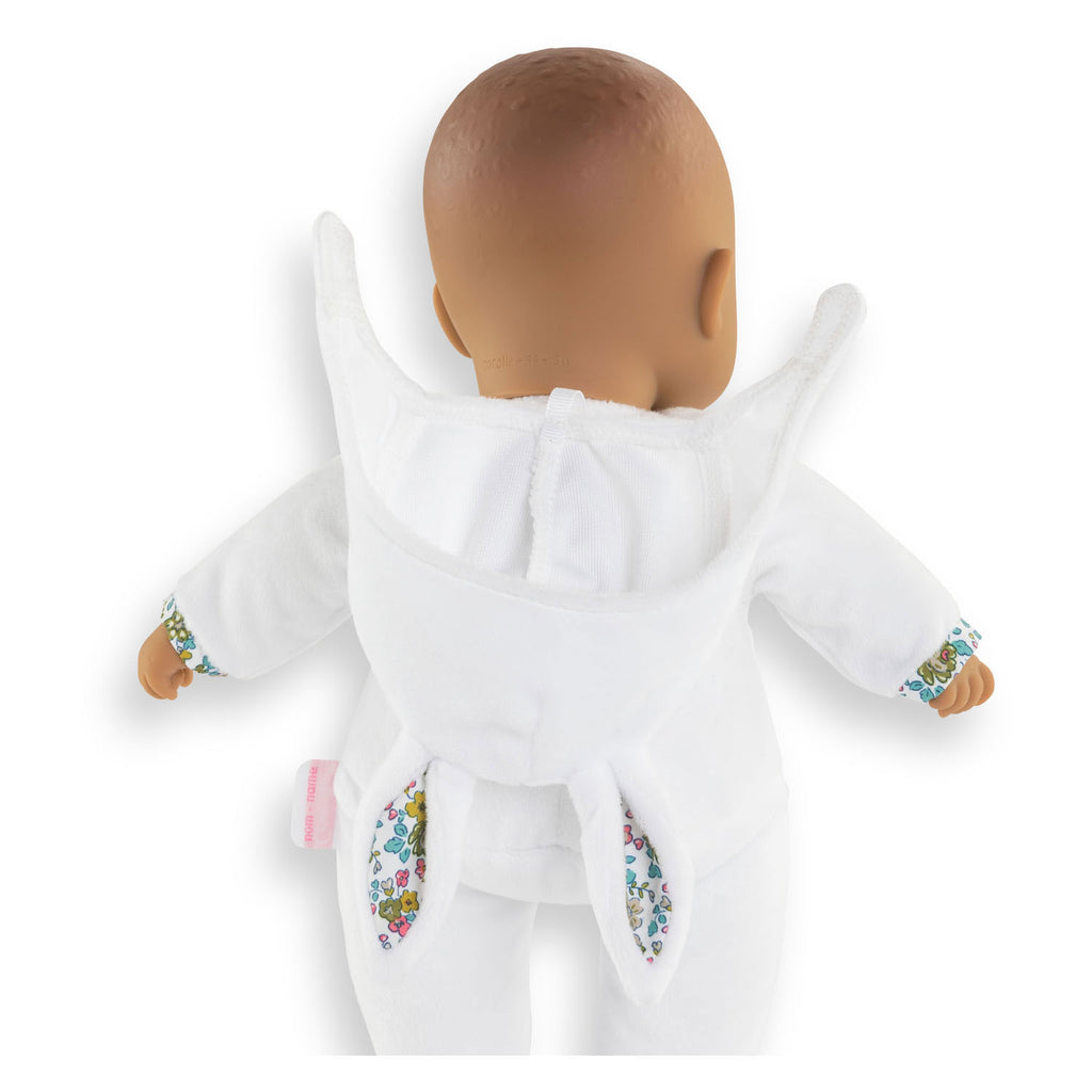 Knuffelpop van Corolle met een zachte, witte outfit met konijnenoortjes en een gezicht en handjes van vinyl. De pop heeft de kenmerkende Corolle vanillegeur en een label voor een naam/telefoonnummer. Geschikt voor kinderen vanaf 9 maanden oud.