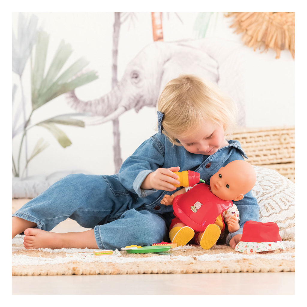 Etentijd verzorgingsset met een babybordje met allerlei lekker eten, bestek, een slab, een doekje en een rietjesbeker. De poppenset is gemaakt voor de Mon Grand Poupon (42 cm) van Corolle, maar kan ook prima voor andere poppen gebruikt worden.