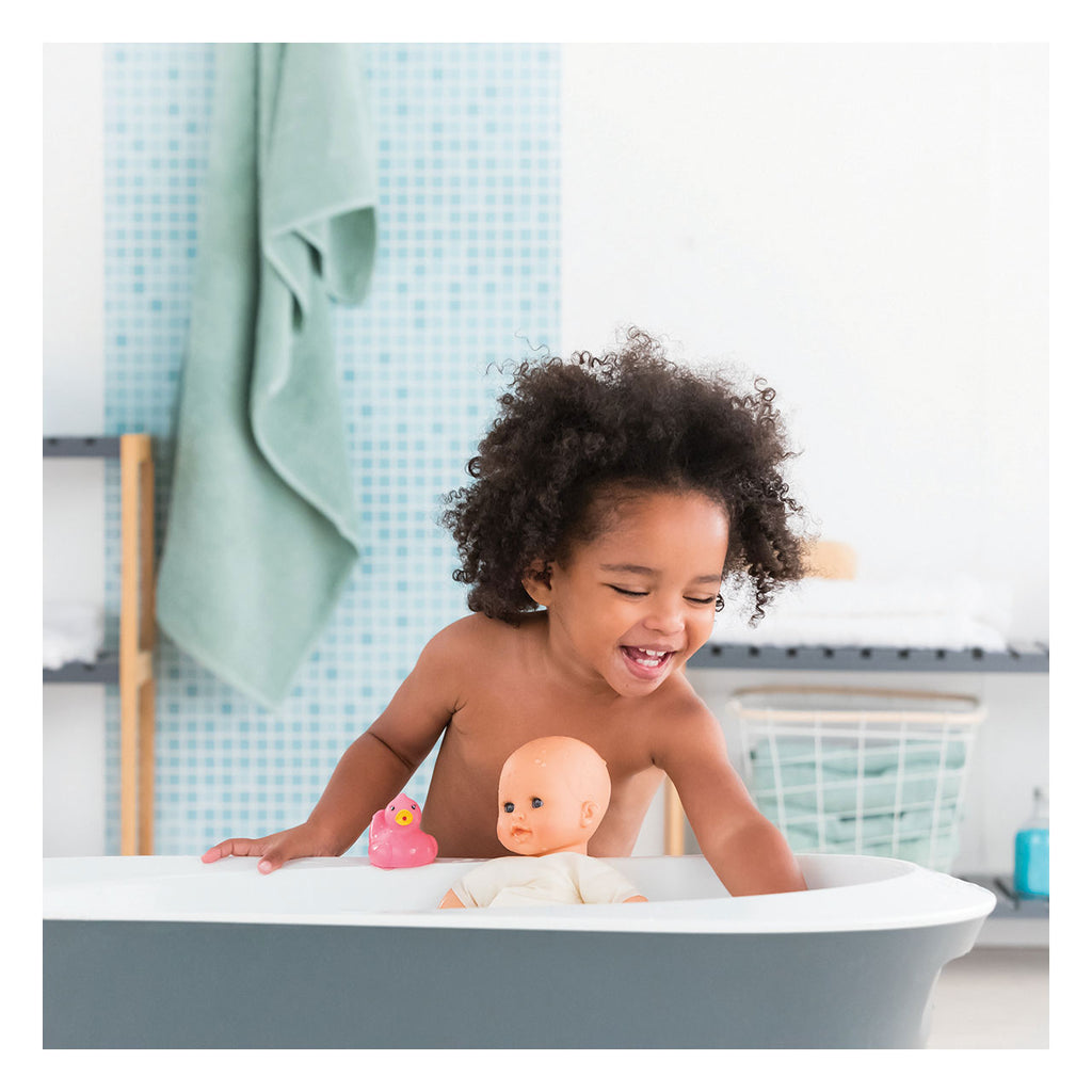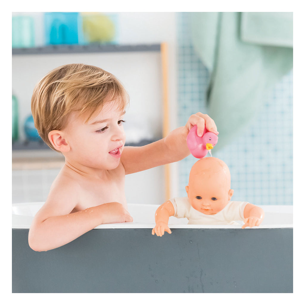 Babypop Coralie is een grappige pop van 30 cm groot. Ze heeft een gezichtje dat heerlijk naar vanille ruikt. De pop is gemaakt van zacht vinyl en voelt fijn aan. Als je haar op haar tapijt legt, gaan haar oogjes in slaapstand. Bij de pop wordt een badeendje geleverd dat waterspuit als je erop drukt na onderdompeling.