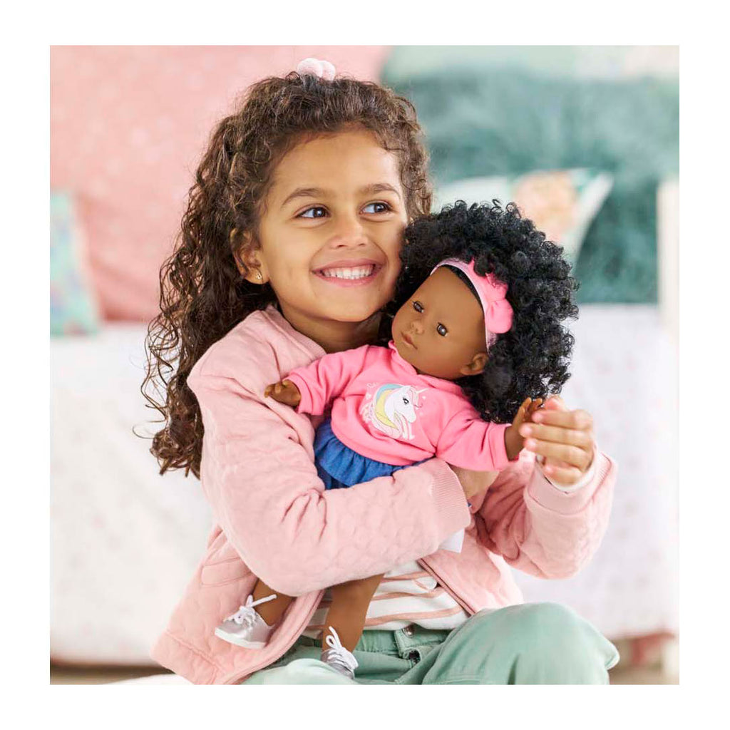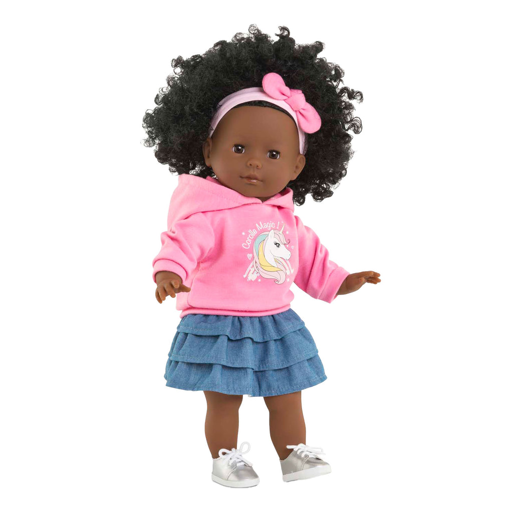 Maëlys is een Corolle-pop van 36 cm. Deze pop heeft een zwarte huid en bruine ogen. Haar gezicht, armen en benen zijn gemaakt van zacht vinyl, met die subtiele vanillegeur, kenmerkend voor Corolle. Als ze op haar rug ligt, sluit ze haar ogen. Maëlys draagt een mooie roze sweater met een eenhoorn-zeefdruk en een elegante rok met ruches in denim-effect. Om haar outfit compleet te maken, draagt ze een paar zilveren sneakers en een roze haarband in haar haar, die bij haar outfit passen. De Corolle Maëlys-pop heeft een ruime keuze aan kleding en accessoires waarmee ze haar look eindeloos kan personaliseren en talloze verhalen kan bedenken, geïnspireerd op het dagelijks leven. Mijn Corolle: Mijn pop, mijn verhalen! Vanaf 3 jaar.