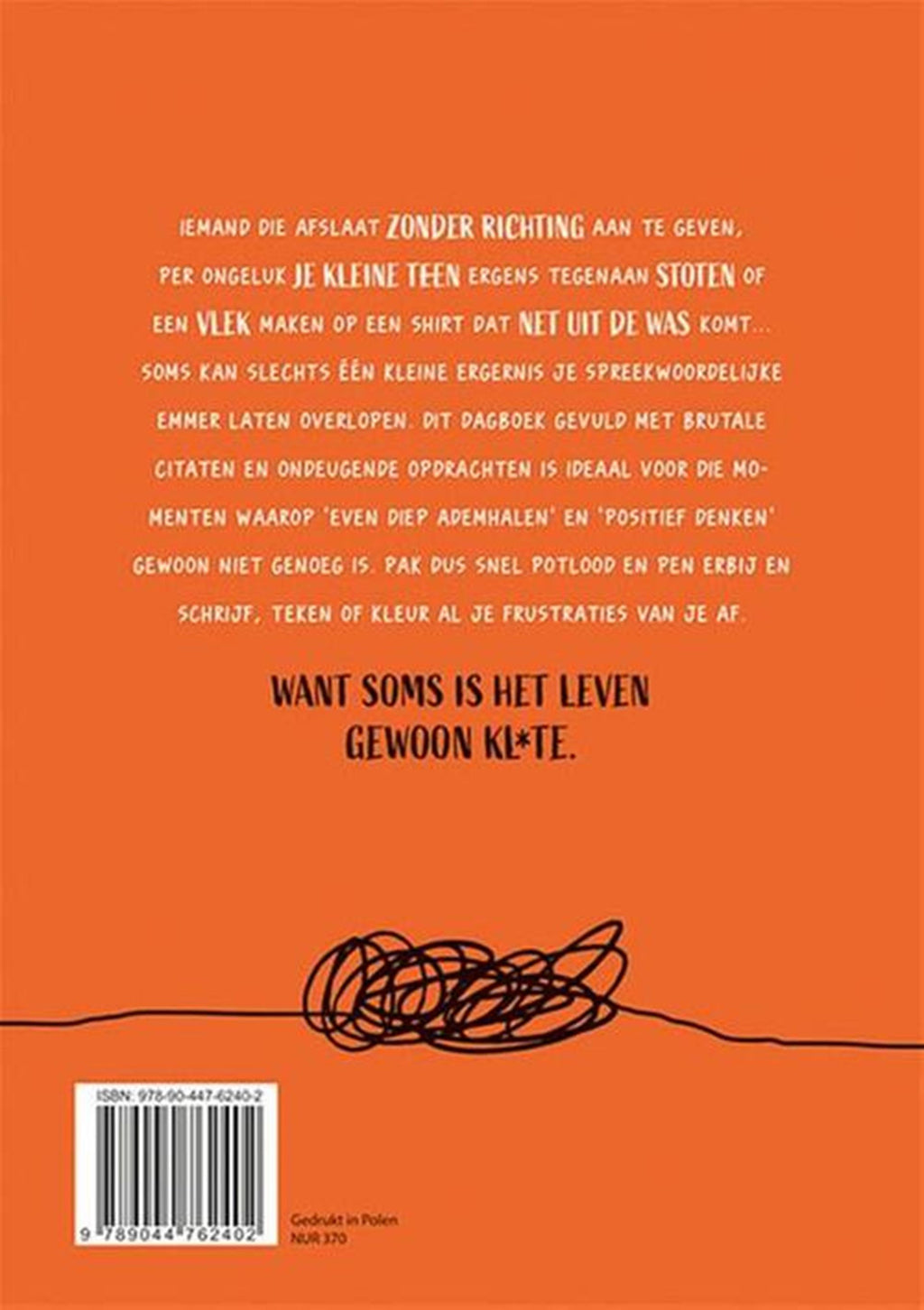 Soms is het leven gewoon kl*te en wil je niets liever dan je frustraties op iets afreageren. Dit dagboek gevuld met brutale citaten en ondeugende opdrachten is ideaal voor die momenten waarop 'even diep ademhalen' en 'positief denken' gewoon niet genoeg is. Iemand die afslaat zonder richting aan te geven, per ongeluk je kleine teen ergens tegenaan stoten of een vlek maken op een shirt dat net uit de was komt... soms kan slechts één kleine ergernis je spreekwoordelijke emmer laten overlopen. Pak dus snel potlood en pen erbij en schrijf, teken of kleur al je frustraties van je af. Uitvoering : Paperback Aantal pagina's : 160 Afmetingen : 210 x 148 x 13 mm.