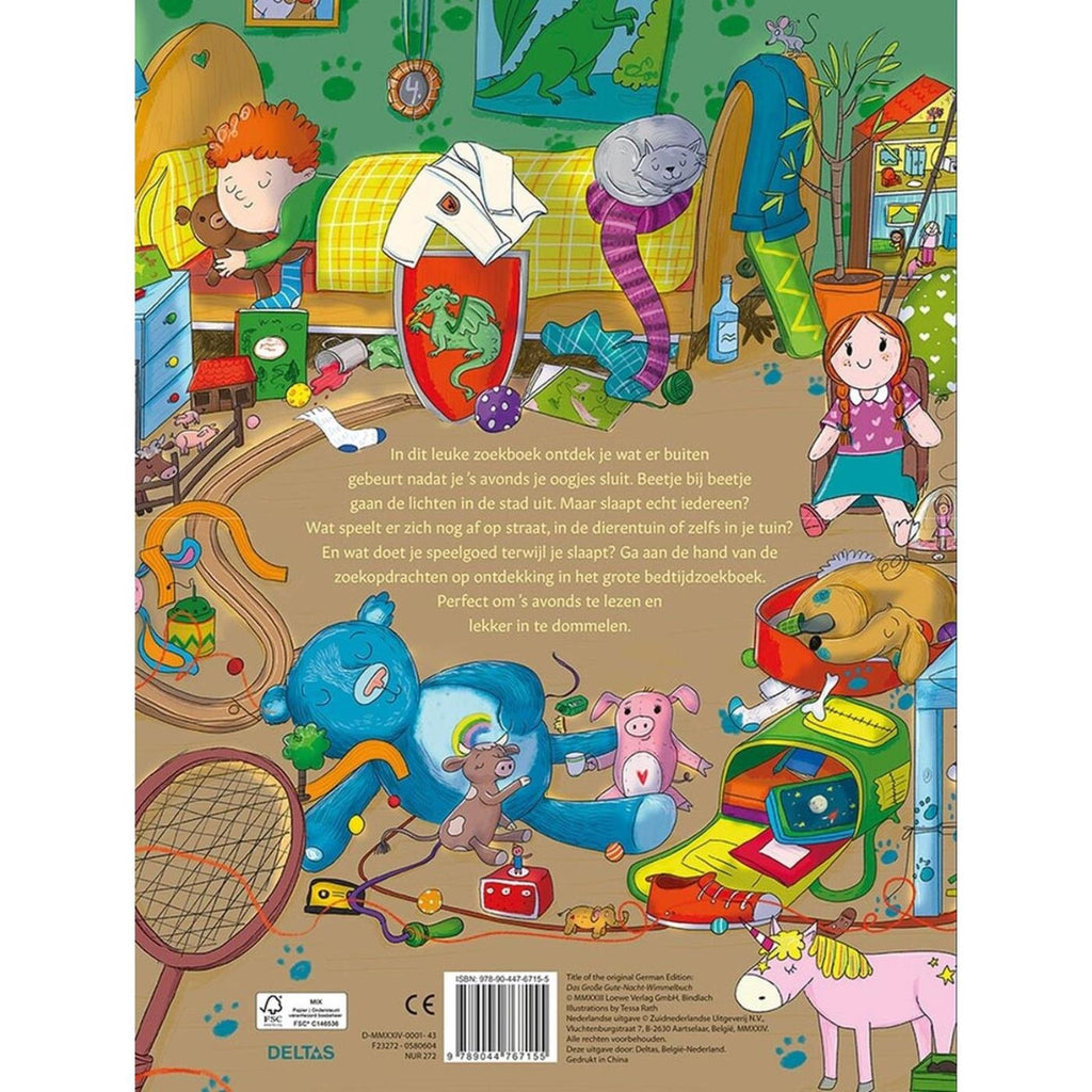In dit leuke zoekboek vol gedetailleerde illustraties ontdekt je kind wat er buiten gebeurt nadat het 's avonds zijn oogjes sluit. Beetje bij beetje gaan de lichten in de stad uit. Maar slaapt echt iedereen? Wat speelt er zich nog af op straat, in de dierentuin of zelfs in de tuin? En wat doet het speelgoed terwijl iedereen slaapt? Ga aan de hand van de zoekopdrachten op ontdekking in het grote bedtijdzoekboek. De stevige kartonnen pagina's zijn perfect voor kleine handjes. Perfect om 's avonds te lezen en lekker in te dommelen. In dit leuke zoekboek vol gedetailleerde illustraties ontdekt je kind wat er buiten gebeurt nadat het 's avonds zijn oogjes sluit. Beetje bij beetje gaan de lichten in de stad uit. Maar slaapt echt iedereen? Wat speelt er zich nog af op straat, in de dierentuin of zelfs in de tuin? En wat doet het speelgoed terwijl iedereen slaapt? Ga aan de hand van de zoekopdrachten op ontdekking in het grote bedtijdzoekboek. De stevige kartonnen pagina's zijn perfect voor kleine handjes. Perfect om 's avonds te lezen en lekker in te dommelen.