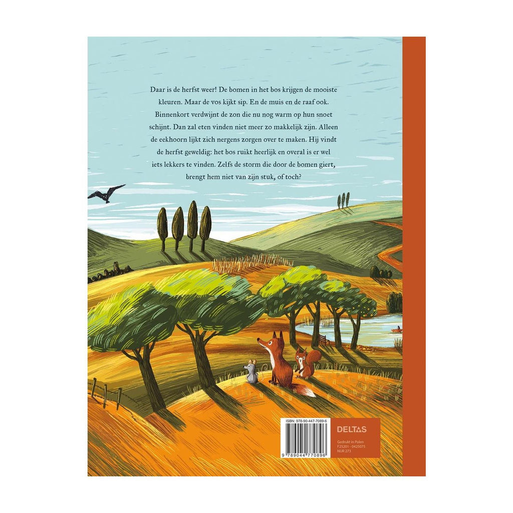 Daar is de herfst weer! De bomen in het bos krijgen de mooiste kleuren. Maar de vos kijkt sip. En de muis en de raaf ook. Binnenkort verdwijnt de zon die nu nog warm op hun snoet schijnt. Dan zal eten vinden niet meer zo makkelijk zijn. Alleen de eekhoorn lijkt zich nergens zorgen over te maken. Hij vindt de herfst geweldig: het bos ruikt heerlijk en overal is er wel iets lekkers te vinden. Zelfs de storm die door de bomen giert, brengt hem niet van zijn stuk, of toch?