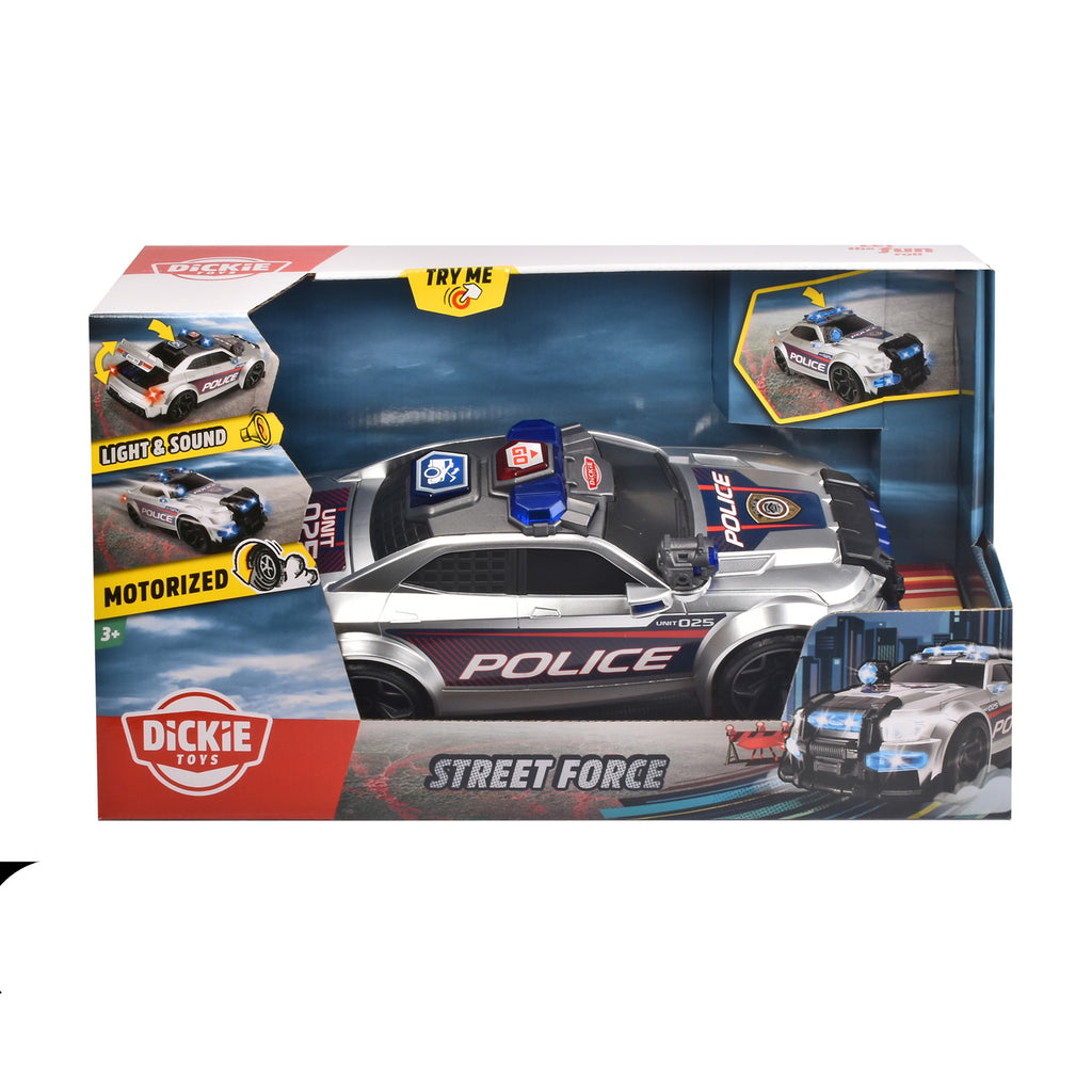 Dickie Toys Street Force: een krachtige politieauto. Iedereen maakt plaats voor deze politieauto! De Dickie Toys Street Force Police Auto is indrukwekkend dankzij de grootte en het gedetailleerde ontwerp. Maar zodra de gemotoriseerde speelgoedauto vooruit gaat - en trekt Aandacht voor zichzelf met licht en geluid - iedereen maakt er plaats voor. De vierwielige wetshandhaver heeft een laars om te openen en vele bewegende onderdelen. De gelijktijdige batterijen zijn al meedoen en zorgen voor onmiddellijk plezier voor kinderen vanaf de leeftijd van drie. Dit spel van Dickie Toys is technisch interessant en nieuwsgierig naar het werk van de wetshandhavers. - Originele aanduiding: straat Kracht - Gemotoriseerde speelgoedauto - Rijdt vooruit - Licht en geluid - Openingstoot - Bewegende onderdelen - Batterijen inbegrepen: 3 x 1,5V-R6 - Lengte: 33 cm