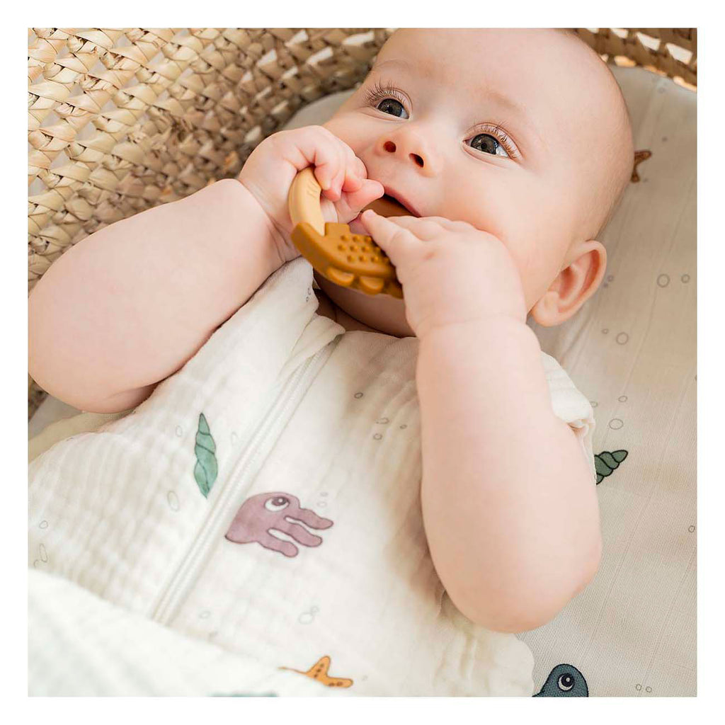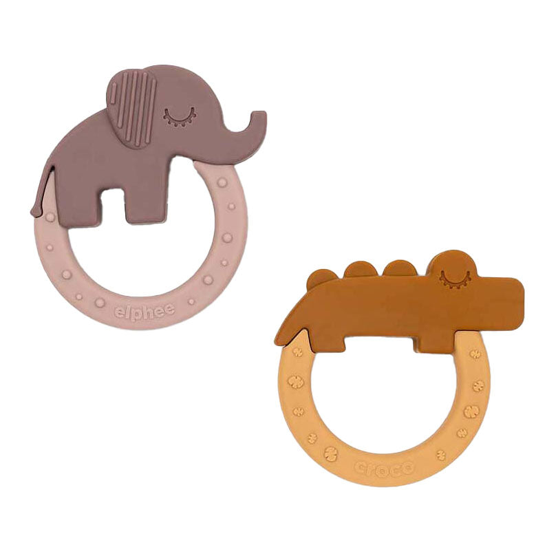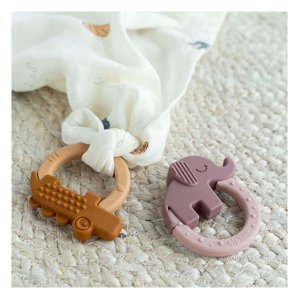 Set met twee zachte siliconen bijtringen in de vorm van de vriendjes Croco en Elphee. De bijtringen zijn gemakkelijk vast te houden door kleine handjes en de verschillende vormen en texturen helpen bij het stimuleren en lastig van pijnlijk tandvlees. Leg ze in de koelkast om af te koelen voor extra verlichting. De bijtset is zo ontworpen dat hij zelfs in het kleinste handje verleden en stimuleert zowel de visuele, orale als tactiele zintuigen van de baby. De zachte poeder- en mosterdtinten, leuke texturen en de aantrekkelijke olifant en leuke krokodil maken deze set tot het perfecte eerste speeltje. Kenmerken • Geschikt voor kinderen vanaf 3 maanden • Temperatuurbestendig: -40°C tot 230°C • Elphee: 7,6 x 8,3 x 2 cm • Croco: 8 x 7,6 x 1,5 cm • Vaatwasserbestendig 100°C