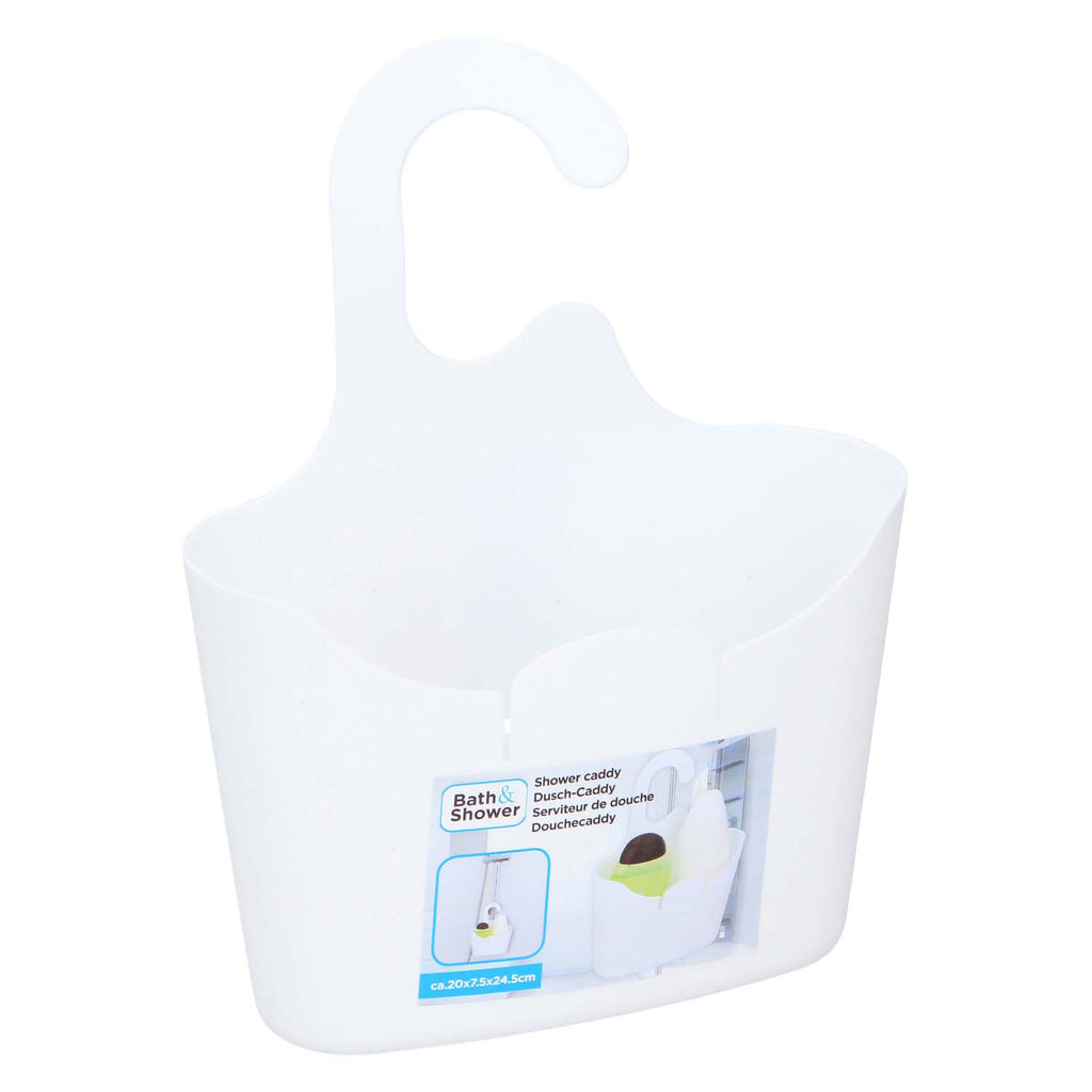 Ophangbaar douchemandje, gemaakt van flexibel kunststof. Afmetingen: ca. 20 x 7,5 x 24 centimeter.