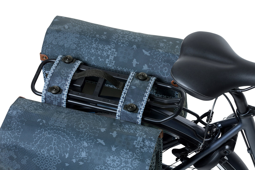 De Basil Bohème dubbele fietstas is een functionele en trendy fietstas met een uniek ontwerp van abstracte bloemen en vogels. Deze fietstas is een leuke winst voor een damesfiets en is ideaal voor het doen van boodschappen of het maken van een lange fietsrit. Met een totale inhoud van 35 liter en waterafstotend polyester materiaal, biedt deze fiets voldoende ruimte en bescherming voor je spullen. De kunstlederen details geven de tas een extra uitstraling en het aansnoerkoord zorgt voor een sluiting. De fietstas wordt inclusief MIK Adapterplaat (70171) geleverd en is geschikt voor MIK-systeemdragers en -draagplaten. Daarnaast is de fiets voorzien van reflectie op alle zijden, waardoor je beter zichtbaar bent in het donker. Productspecificaties - Model: Achtertas - Dubbel of enkel: Dubbel - Geschikt voor: Elektrische fiets, stadfiets, city-trekking fiets - Activiteit: Boodschappen, eropuit - Materiaal: Polyester - Kleur: Blauw - Systeem: MIK Adapterplaat 70171 (inclusief) - Ook te gebruiken als: Nvt - Toepassing: Bagagedrager - Extra vak voor: Nvt - Sluiting hoofdvak: Kliksluiting - Laptopvak: Nee - Zijvak(ken): Nee - Voorvak(ken): Nee - Diefstalbeveiliging: Nee - Waterbestendig: Spatwaterdicht - Snelbinders mogelijk: Nee - Afneembaar: Afneembaar icm MIK-systeem - Handvat: Ja - Capaciteit: 10 kg totaal, met een maximum van 5 kg per tas - Garantie: 2 jaar, via het verkooppunt waar je het product gekocht hebt - Binnenvak: Nee