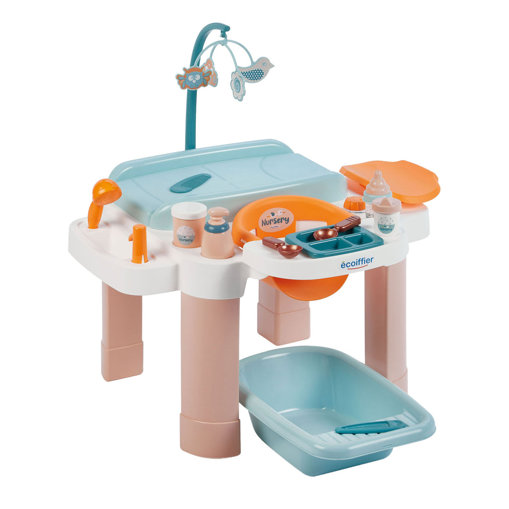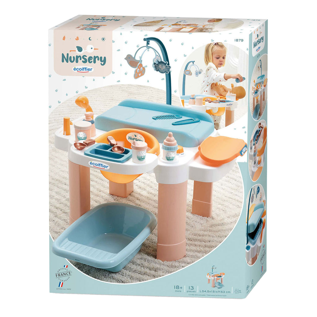 13-delige poppen verzorgingstafel met eetstoeltje en tafeltje, verschoontafel, badje en geïntegreerd poppentoilet. Bevat verschillende accessoires zoals een babyweegschaal, een kam, een flesje en bestek. Geschikt voor kinderen vanaf 18 maanden oud en voor poppen van maximaal 32 centimeter groot.