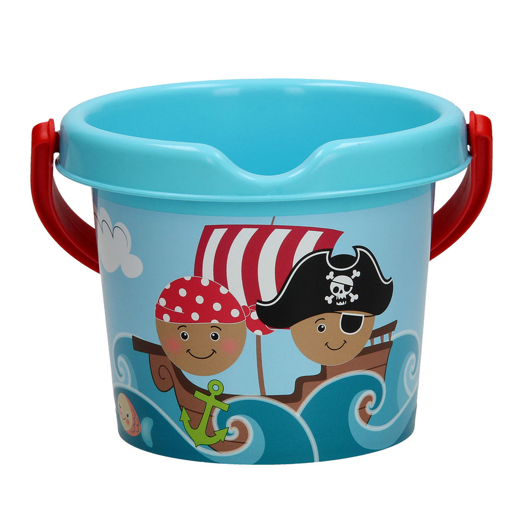 Verzamel water, zand of schelpen met dit kleine emmertje voor piraten. Het emmertje is gemaakt van stevig kunststof en heeft rondom een stoere print van piraten. Aan het stevige handvat neem je hem gemakkelijk overal mee naar toe.