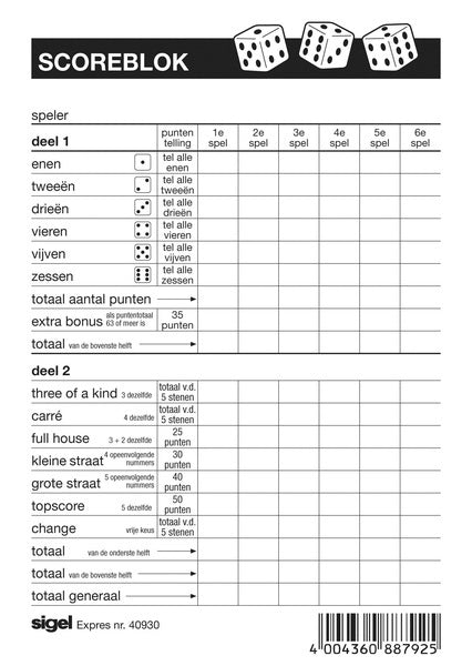 Expres scoreblok sigel voor yahtzee