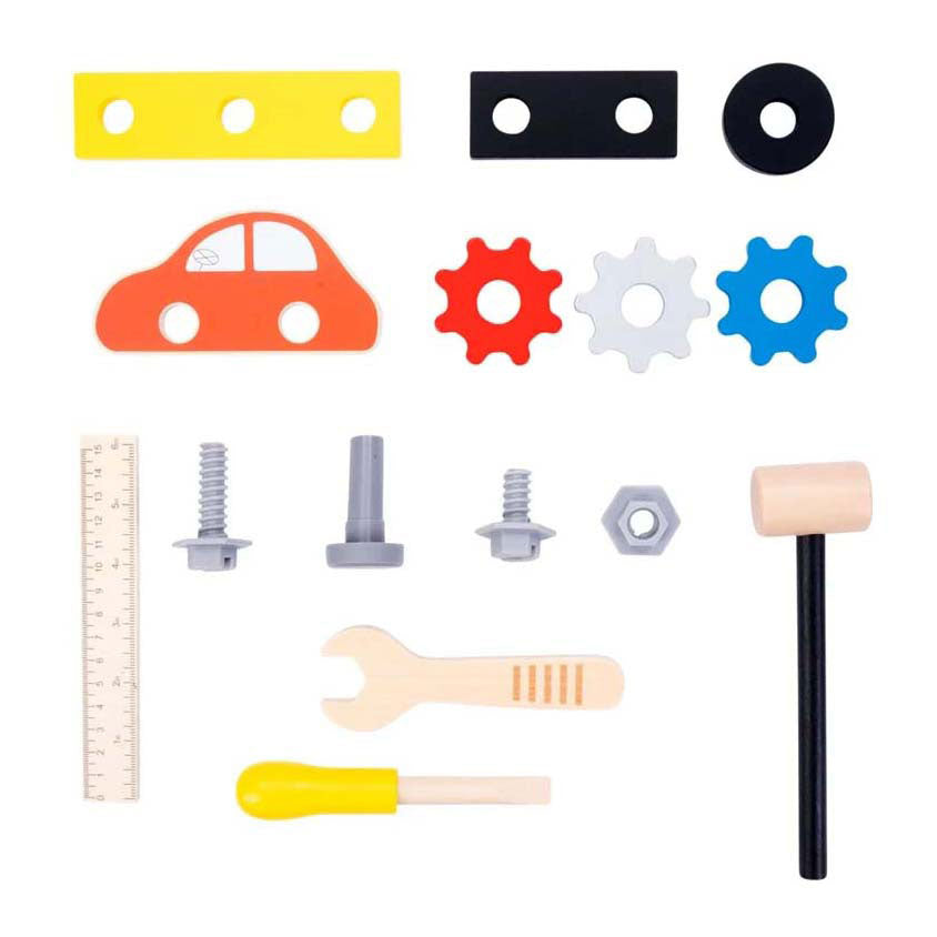 Ga aan de slag als een echte timmerman! Het gereedschapskistje met inhoud is gemaakt van hout en gemakkelijk mee te nemen. De gereedschapskist wordt geleverd met 33 realistische onderdelen om kinderen urenlang bezig te houden. De gereedschapskist bevat een hamer, schroevendraaier, liniaal, moersleutel, moeren en bouten, spijkers, tandwielen, auto, wielen, en planken met gaten. Dit educatieve speelgoed is perfect voor de ontwikkeling van de cognitieve vaardigheden van kinderen. Het houtwaardige houten materiaal staat garant voor functioneel speelplezier. De set bevat verf op waterbasis en kindvriendelijke materialen. Specificaties: Kleur: geel Materiaal: hout Geslacht: junior Breedte: 12 cm Hoogte: 15 cm Lengte: 25 cm
