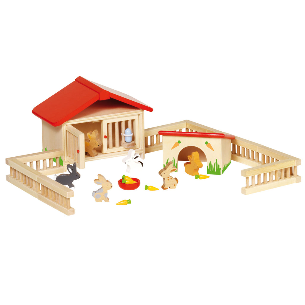 Hou jij ook zo veel van succesvolle konijntjes? Dan is dit houten konijnenhok echt wat voor jou! Zorg dat jouw konijntjes genoeg te eten hebben en laat ze vrolijk rondrennen in de konijnenren. Een leuke aanvulling op de houten boerderij. De set is 25-delig en bestaat uit een houten konijnenhok en ren. Inclusief verschillende houten accessoires.
