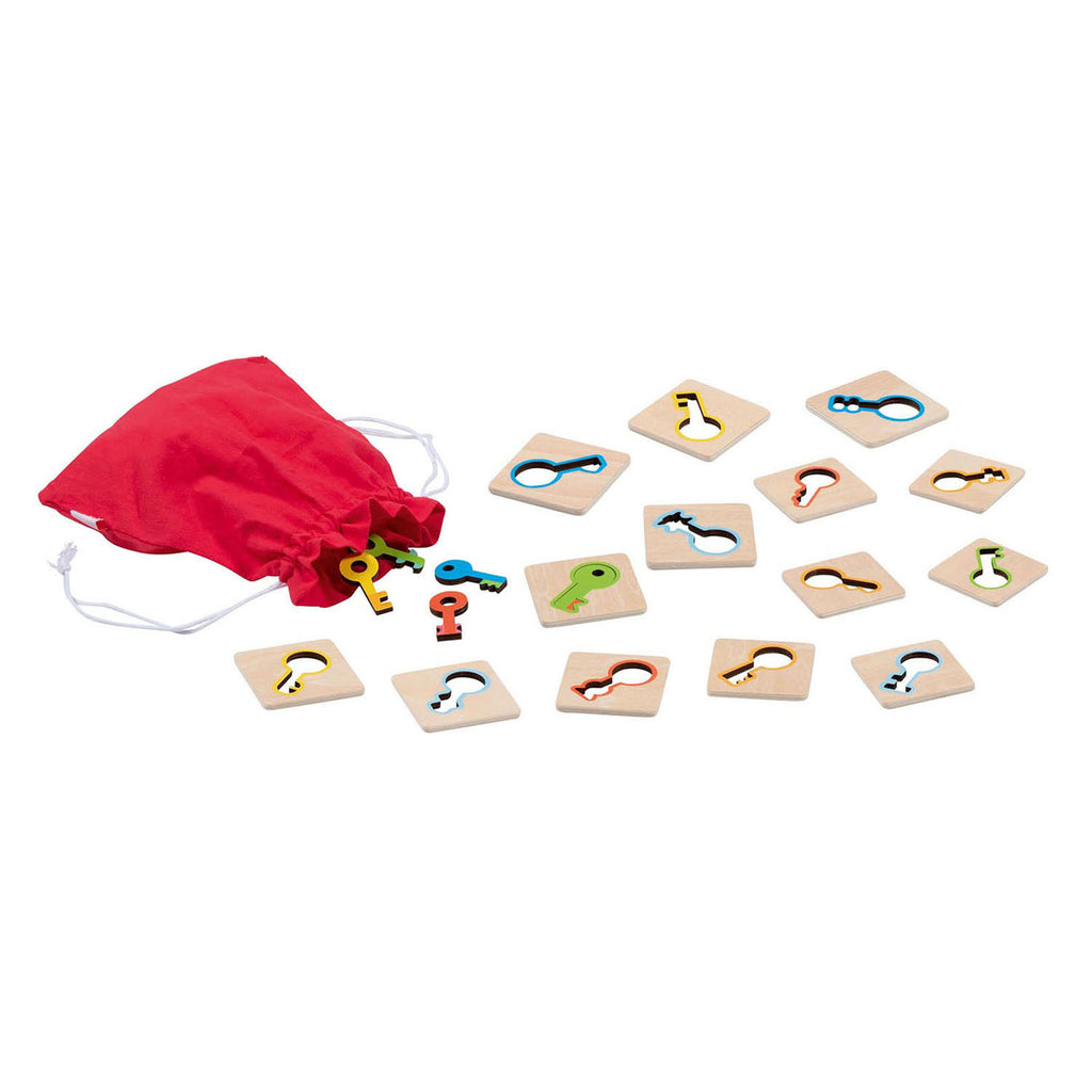 Houten Memospel van Goki. Match de juiste sleutel met het tegeltje. Elke tegel heeft een puls voor beginners en een blanco kant voor de gevorderde spelers. De tegeltjes zelf zijn 5 x 5 centimeter groot en het is geschikt voor kinderen vanaf 3 jaar. Inhoud: 18 houten sleutels en tegeltjes, zakje en de instructies.