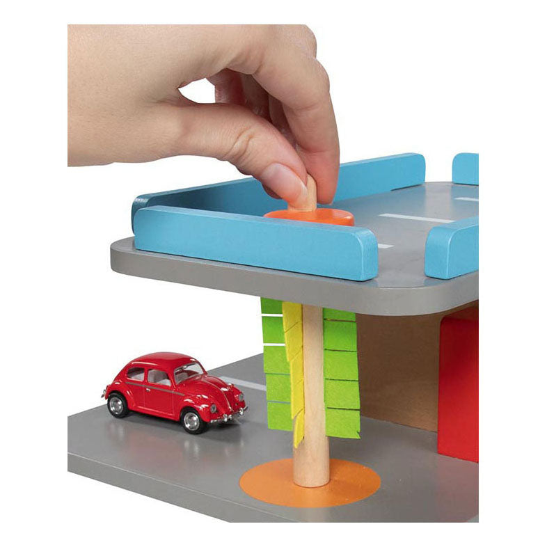 Deze compacte parkeergarage heeft alles wat kleine autoliefhebbers kunnen wensen. Op twee verdiepingen kunnen ze parkeren, benzinetanken en hun autowassen. Het is drie keer een bezoek waard! Auto's zijn niet inbegrepen. Afmeting: 22 bij 33 bij 11,5 centimeter. Materiaal: hout. Geschikt voor kinderen vanaf 3 jaar oud.