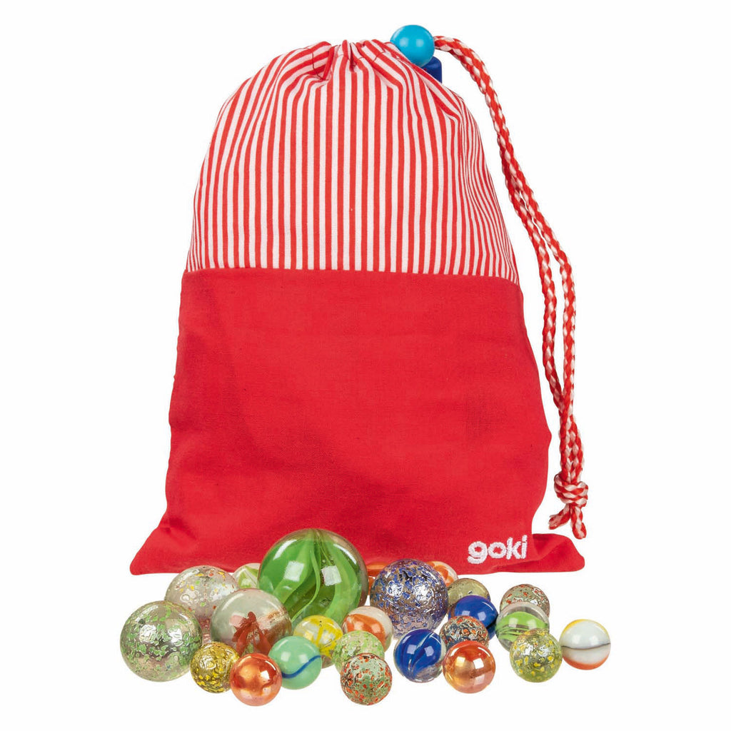 50 knikkers voor een uur strandplezier. Of het nu jeu de boules, holeclicker of knikkeren is - alle spellen zijn uitstekend te spelen met knikkers. Of wat kun je nog meer bedenken? Ø= 1,6 - 3,5 cm Kenmerken • Aanbevolen leeftijd: 3+ • Materiaal: hout, textiel, glas