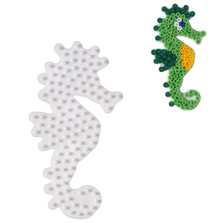 Strijkkralen kun je in bijna elk gewenst patroon leggen en door middel van strijkpapier en een strijkijzer samensmelten. Maar daarvoor heb je natuurlijk wel een grondplaat nodig. Witte grondplaat in de vorm van een zeepaardje. Hama strijkkralenbordje in de vorm van een zeepaard. Exclusief strijkkralen.