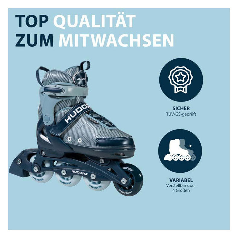 Of je nu rond het meer skate of naar een bestemming, samen skaten is leuk voor het hele gezin. Bewegen in de frisse lucht is goed en traint de motoriek en het evenwichtsgevoel. HUDORA heeft de juiste inline skates voor kinderen! Het Leon-model voor vaste skaters maakt indruk met zijn snelle loopeigenschappen en groot comfort. ABEC 5 kogellagers en superlichte wielen maximaal rijplezier. De binnenschoen past zich perfect aan de voet aan en is perfect opgevuld. De schoen kan eenvoudig worden gemaakt dankzij de aantrekhulp en het snelvetersysteem met powerstrap en drukgesp. Als het warm wordt, zorgt het voor het luchtdoorlatende Airvent-systeem voor verkoeling. Bijzonder praktisch: met de microverstelling groeien de skates over vier maten. In maat verstelbaar voor schoenmaat 33 tot en met 36. Kenmerken • Schokbestendig PP-chassis • In maat verstelbaar over 4 maten • Micro Systeem PP slagvaste schaal • Power Strap Press Lock-gesp • Instaphulp • Snel vetersysteem • Ventilatiesysteem • Gegoten PU-wielen, transparant, high rebound 82 A kogellagers ABEC 5, carbon