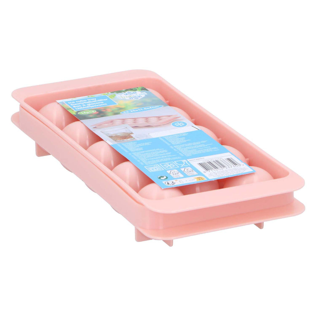 Roze ijsblokjesvorm met deksel voor het maken van 14 ronde ijsklontjes. Afmetingen: 25,5 x 4 x 11,5 centimeter.