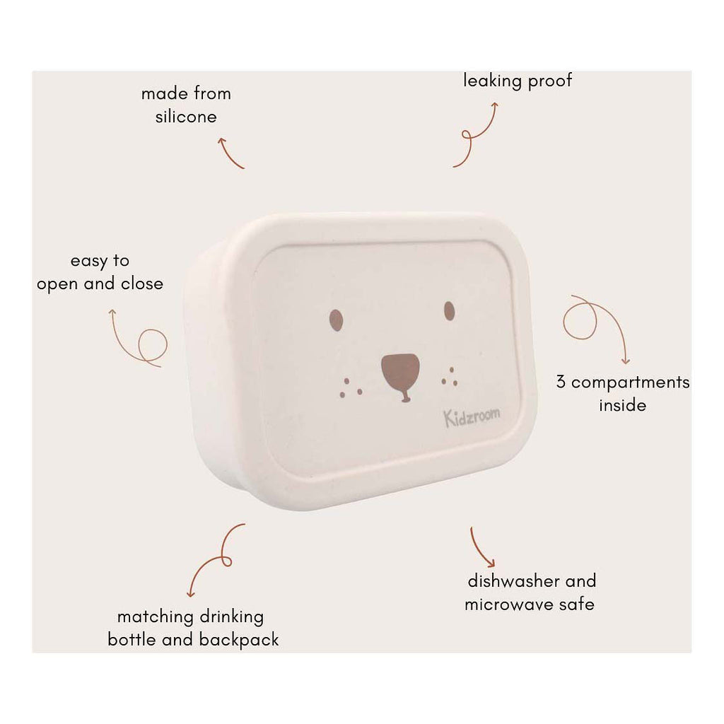Wat een lieve lunchbox! Deze prachtige lunchbox van Kidzroom uit de Lovely Lunch-collectie is een echte must-have voor kinderen. De lunchbox heeft een stijlvolle beige kleur en is versierd met een schattig teddybeer gezicht. Dankzij het zachte siliconenmateriaal is de lunchbox eenvoudig te openen en te sluiten, perfect voor kleine kindjes. De binnenkant is slim ingedeeld in drie compartimenten, zodat je alle onderdelen van de lunch netjes en vers kunt houden. Door het silicone materiaal kan hij in de magnetron en in de vaatwasser. Praktisch én schattig! Voeg deze betoverende lunchbox van Kidzroom vandaag nog toe aan je assortiment.