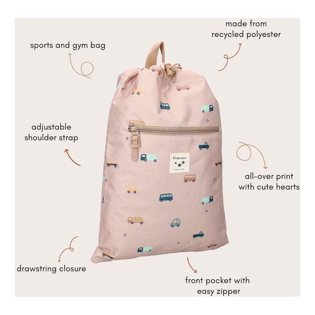Raak geïnspireerd door deze te gekke, duurzame gymtas van Kidzroom uit de Sweet Cuddles collectie. Deze gymtas is een ideaal item om mee te nemen naar de gym- of zwemles. Hij heeft een beige kleur en is voorzien van een all-over print met auto's. De tas heeft een treksluiting met touwtjes en verstelbare schouderbanden. Ook heeft de tas een superhandig voorvak met ritssluiting voor kleine spullen, zoals sleutels, elastiekjes of een portemonnee. Verder is deze gymtas gemaakt van 100% gerecycled polyester. Dit maakt dit leuke item ook nog eens erg duurzaam. Met de verstelbare schouderbanden is deze tas voor iedereen op maat te maken. Zo kunnen de kleinste kinderen al genieten van een super gave gymtas!